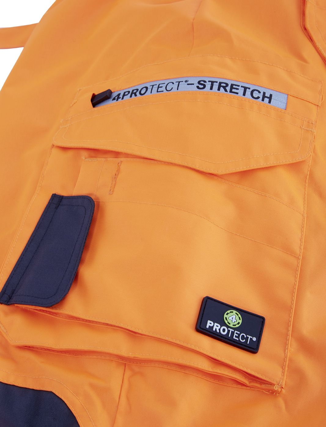 Zertifiziert nach EN ISO 13688:2013 (allgemeine Anforderungen), EN ISO 20471:2013+A1:2016 Klasse 2 (Warnschutz) und 343:2019 (Regenschutz). Wind- und wasserdichte Ausstattung. Segmentierte, auflaminierte extra breite Reflexstreifen (7 cm), umlaufend um die Beine, dunkel abgesetzter Saumbereich verhindert leichtes Anschmutzen. Elastischer Gummizug im Taillenbund. Seitliche Knöpfung und Beinnähte mit Reißverschlussöffnung in der Seitennaht erleichtern das Anziehen. Hosenschlitz mit Reißverschluss. Elastische Hosenträger mit Verstellschnallen. Kniepolster-Taschen, 1 Latztasche mit Reisverschluss, 2 Eingriffstaschen vorn, 1 große Cargotasche mit vorgesetzter Handy- und Stifttasche sowie 2 Gesäßtaschen am Rückteil. Warm wattiertes, gestepptes Innenfutter. Diese Bekleidung ist zusätzlich im System mit dem Knieschutz (Art. 8400) nach EN 14404:2010, Typ 2, Leistungsstufe 1 zertifiziert.