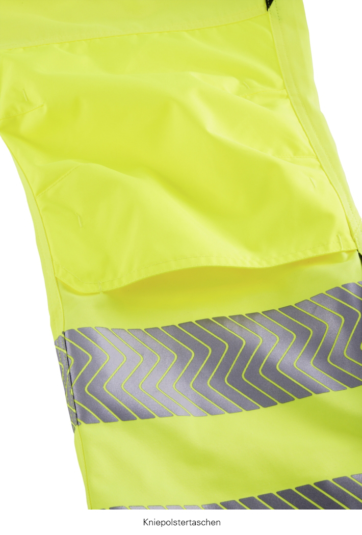 Zertifiziert nach EN ISO 13688:2013 (allgemeine Anforderungen) und EN ISO 20471:2013+A1:2016 (Warnschutz) Klasse 2. Hervorragende Passform dank ergonomischer, körpernaher Schnittform in Verbindung mit Stretcheinsätzen. Das belastbare Twill-Gewebe ist gleichzeitig angenehm weich und geschmeidig. Segmentierte, auflaminierte, extra breite (7 cm) Reflexstreifen, umlaufend um die Beine. Dunkel abgesetzte Besätze an den Innenbeinen, Gesäß und Tascheneingriffen verhindern ein leichtes Anschmutzen. Knietaschen für Polster, sowie Taschenböden und Hosensäume aus abriebfestem Oxford-Gewebe. Eine Cargotasche auf dem linken Hosenbein mit vorgesetzter Handy- und Stifttasche. 2 Eingriffstaschen vorn, 2 Gesäßtaschen, eine mit und eine ohne Taschenklappe. Zollstocktasche und Hammerschlaufe auf der rechten, hinteren Beinseite. Eine Klettlasche zur Befestigung diverser Tools und D-Ring am Taillenbund sowie eine verstellbare Bundweite. Diese Bekleidung ist zusätzlich im System mit dem Knieschutz (Art. 8400) nach EN 14404:2010, Typ 2, Leistungsstufe 1 zertifiziert.