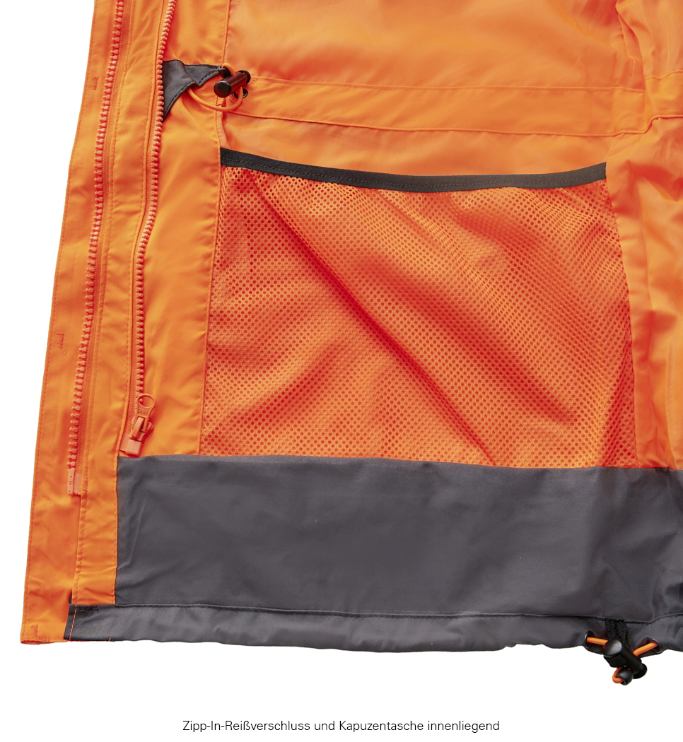 Zertifiziert nach EN ISO 13688:2013 (allgemeine Anforderungen), EN ISO 20471:2013+A1:2016 (Warnschutz) Klasse 2 = Gr. XS, EN ISO 20471:2013+A1:2016 (Warnschutz) Klasse 3 = Gr. S-6XL und EN 343:2019 (Regenschutz). Wind- und wasserdichte Ausstattung bei hoher Atmungsaktivität, die eine lange Tragedauer gestattet. Segmentierte, auflaminierte Reflexstreifen, umlaufend um Körper und Ärmel sowie über die Schulterpartien (Hosenträgerreflexstreifen). Dunkel abgesetzter Saum- und Manschettenbereich verhindert leichtes Anschmutzen. Weitenverstellung in Taille und Saum, doppelt abgedeckter Front-Reißverschluss, bandverschweißte Nähte, abzippbare Sturmkapuze mit diversen Verstelloptionen. 2 Brusttaschen, 2 großformatige Hüfttaschen sowie 1 Napoleon-Tasche mit integrierter, abnehmbarer ID-Tasche, unter der Frontleiste. Im Futter 1 Brust- und 1 große Tasche für Kapuze, sowie Service-Reißverschluss zum einfachen Bedrucken und Besticken. Unterarmbelüftung, justierbare Klett-Manschetten. Vorbereitet zum Einzippen von den folgenden 4PROTECT® Jacken: für die Größen XS: - SEATTLE: 3460=leuchtorange und 3465=leuchtgelb - TYLER: 3472=leuchtorange und 3477=leuchtgelb - MONTANA: 3388=schwarz, 3390=grau/schwarz und 3391=navy/schwarz - IDAHO: 3322=Weste, schwarz für die Größen S-6XL: - SEATTLE: 3460=leuchtorange und 3465=leuchtgelb - TYLER: 3472=leuchtorange und 3477=leuchtgelb - MONTANA: 3388=schwarz, 3390=grau/schwarz und 3391=navy/schwarz - IDAHO: 3322=Weste, schwarz - HOUSTON: 3470=leuchtorange und 3475=leuchtgelb - DALLAS: 3360=schwarz - MAINE: 3355=schwarz/weiß-melange - RENO: 3418=schwarz/leuchtgelb