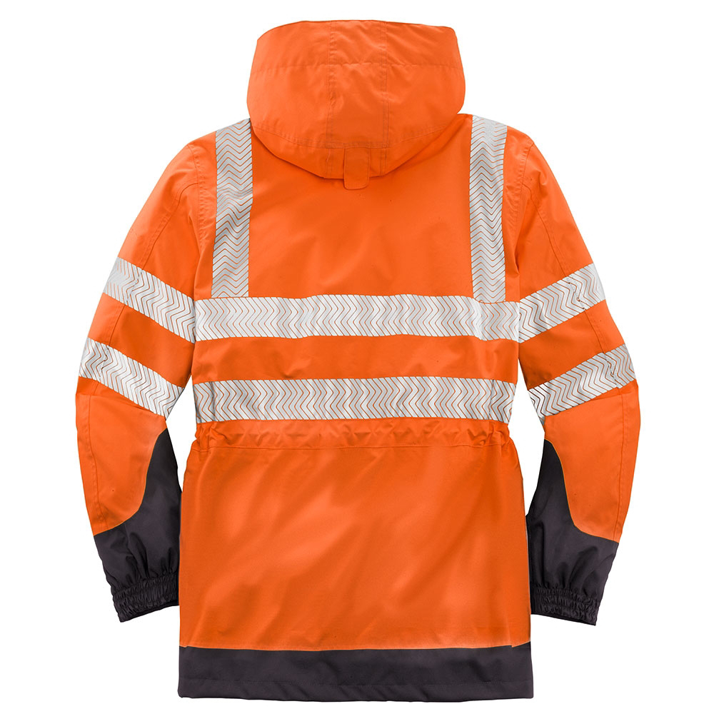 Funktionalität trifft Design. Einsetzbar bei Gefahren durch schlechte Sicht schützt TAMPA mit wind- und wasserdichter Ausstattung auch vor schlechtem Wetter. Unterstützt wird dies durch funktionelle Details, wie einem doppelt abgedecktem Front-Reißverschluss, eine abzippbare Sturmkapuze mit diversen Verstelloptionen sowie der Möglichkeit diverse Jacken/Weste aus dem 4PROTECT®-Programm einzuzippen. Eine hohe Atmungsaktivität gestattet zudem eine lange Tragedauer. Der dunkel abgesetzte Saum- und Manschettenbereich als Schutz vor schneller Verschmutzung sowie eine abnehmbare ID-Tasche zeugen von einer durchdachten Funktionalität. Zudem bietet TAMPA durch einen Service Reißverschluss die unkomplizierte Möglichkeit der Bedruckung in unterschiedlichen Formaten (z.B. 110 x 70 mm Brust und 260 x 100 mm Rücken), ohne einen abwertenden Einfluss auf die Warnschutz-Klassifizierung.