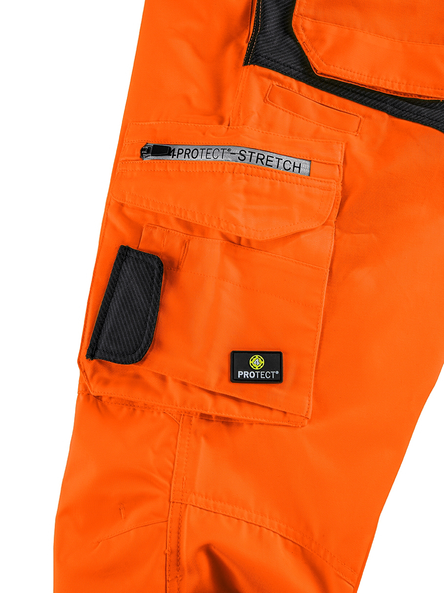 Zertifiziert nach EN ISO 13688:2013 (allgemeine Anforderungen) und EN ISO 20471:2013+A1:2016 (Warnschutz) Klasse 2. Hervorragende Passform dank ergonomischer, körpernaher Schnittform in Verbindung mit Stretcheinsätzen. Das belastbare Twill-Gewebe ist gleichzeitig angenehm weich und geschmeidig. Segmentierte, auflaminierte, extra breite (7cm) Reflexstreifen, umlaufend um die Beine. Dunkel abgesetzte Besätze an den Innenbeinen, Gesäß und Tascheneingriffen verhindern leichtes Anschmutzen. Knietaschen, sowie Taschenböden und Hosensäume aus abriebfestem Oxford-Gewebe. Eine Cargotasche auf dem linken Hosenbein mit vorgesetzter Handy- und Stifttasche. 2 Eingriffstaschen vorn, 2 Gesäßtaschen, eine mit und eine ohne Taschenklappe. Zollstocktasche und Hammerschlaufe auf der rechten hinteren Beinseite. Latz mit aufgesetzter, großer Klappentasche. Elastische Hosenträger mit Verstellschnallen. Diese Bekleidung ist zusätzlich im System mit dem Knieschutz (Art. 8400) nach EN 14404:2010, Typ 2, Leistungsstufe 1 zertifiziert.