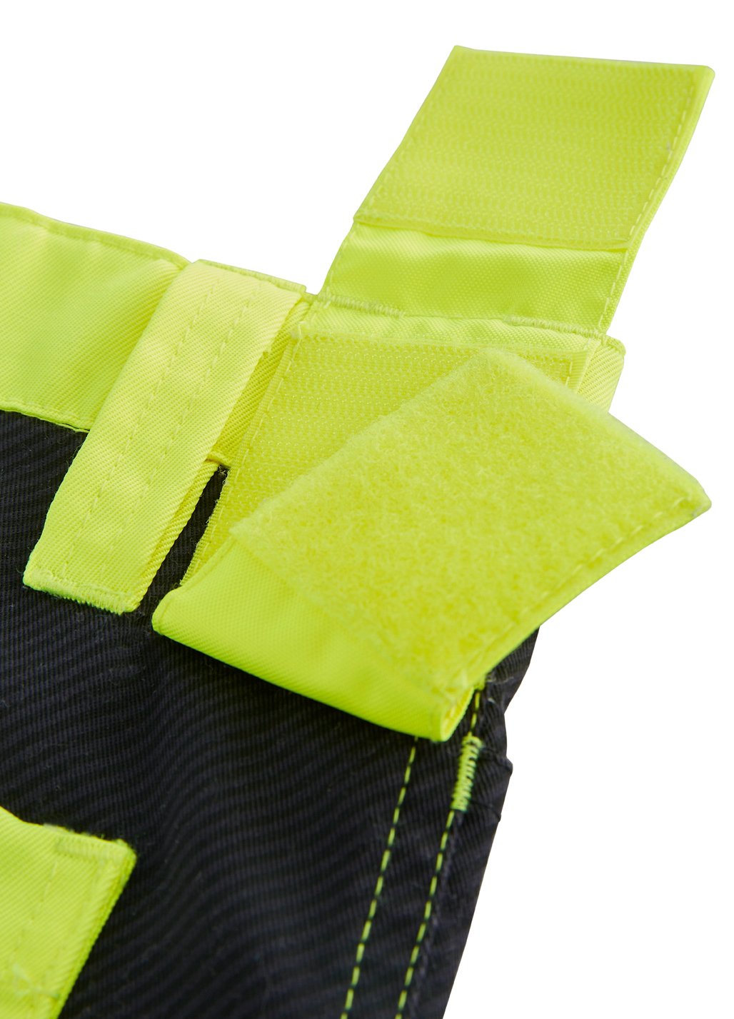 Zertifiziert nach EN ISO 13688:2013 (allgemeine Anforderungen) und EN ISO 20471:2013+A1:2016 (Warnschutz) Klasse 1. Hervorragende Passform dank ergonomischer, körpernaher Schnittform in Verbindung mit Stretcheinsätzen. Das belastbare Twill-Gewebe ist gleichzeitig angenehm weich und geschmeidig. Segmentierte, auflaminierte, 5 cm breite Reflexstreifen, umlaufend um die Hosenbeine der Shorts. Dunkel abgesetzte Besätze am Hosenboden verhindern ein leichtes Anschmutzen. Taschenböden aus abriebfestem Oxford-Gewebe. Eine Cargotasche auf dem linken Hosenbein. 2 Eingriffstaschen vorn, 2 Gesäßtaschen, eine mit und eine ohne Taschenklappe. Zollstocktasche und Hammerschlaufe auf der rechten, hinteren Beinseite. Eine Klettlasche zur Befestigung diverser Tools und D-Ring am Taillenbund sowie eine verstellbare Bundweite.
