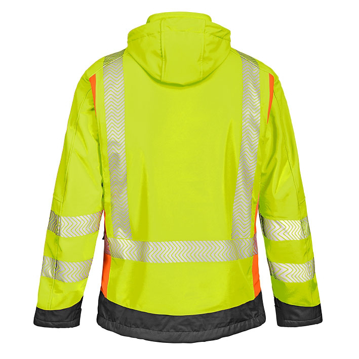 Sicher, cool und praktisch. Die Kombination der Warnschutzfarben bei der Jacke HOUSTON gibt ihr ein modernes Design. Sie trägt sich besonders angenehm durch die Verbindung von elastischem Gewebe mit körpernaher Schnittform und ergonomisch geformten Ärmeln. Neuartige, segmentierte Reflexstreifen, die direkt auflaminiert werden, laufen um Körper und Ärmel sowie über die Schulterpartien (Hosenträgerreflexstreifen) und sorgen für eine hohe Sicherheit und Sichtbarkeit. Eine sehr gute Atmungsaktivität und Wasserdichtigkeit des Gewebes, eine laminierte Funktionsmembran und die abzippbare Sturmkapuze schützen zuverlässig vor Wind, Regen und Kälte. Die robuste Ripstop-Gewebestruktur verhindert ein Weiterreißen und ist dadurch besonders langlebig. Dunkel abgesetzte, abriebfeste Besätze am Saum und Ärmelmanschetten schützen gegen Anschmutzen und Abstoßen. Diverse Verstaumöglichkeiten sowie eine aufwendige Innenverarbeitung sorgen für eine hohe Funktionalität im Arbeitsalltag.