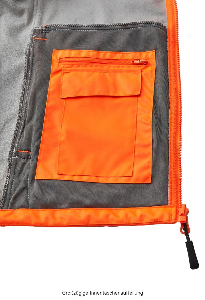 Obermaterial: 100% Polyester (Softshell) Besatzmaterial: 100% Polyester Innenfutter: 100% Polyester (Microfleece) Reflexmaterial: Segmentierte, auflaminierte Reflexstreifen
