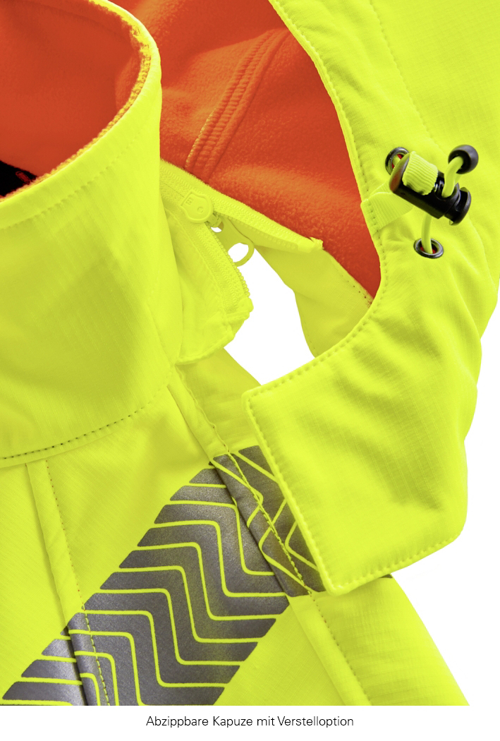 Sicher, cool und praktisch. Die Kombination der Warnschutzfarben bei der Jacke HOUSTON gibt ihr ein modernes Design. Sie trägt sich besonders angenehm durch die Verbindung von elastischem Gewebe mit körpernaher Schnittform und ergonomisch geformten Ärmeln. Neuartige, segmentierte Reflexstreifen, die direkt auflaminiert werden, laufen um Körper und Ärmel sowie über die Schulterpartien (Hosenträgerreflexstreifen) und sorgen für eine hohe Sicherheit und Sichtbarkeit. Eine sehr gute Atmungsaktivität und Wasserdichtigkeit des Gewebes, eine laminierte Funktionsmembran und die abzippbare Sturmkapuze schützen zuverlässig vor Wind, Regen und Kälte. Die robuste Ripstop-Gewebestruktur verhindert ein Weiterreißen und ist dadurch besonders langlebig. Dunkel abgesetzte, abriebfeste Besätze am Saum und Ärmelmanschetten schützen gegen Anschmutzen und Abstoßen. Diverse Verstaumöglichkeiten sowie eine aufwendige Innenverarbeitung sorgen für eine hohe Funktionalität im Arbeitsalltag.