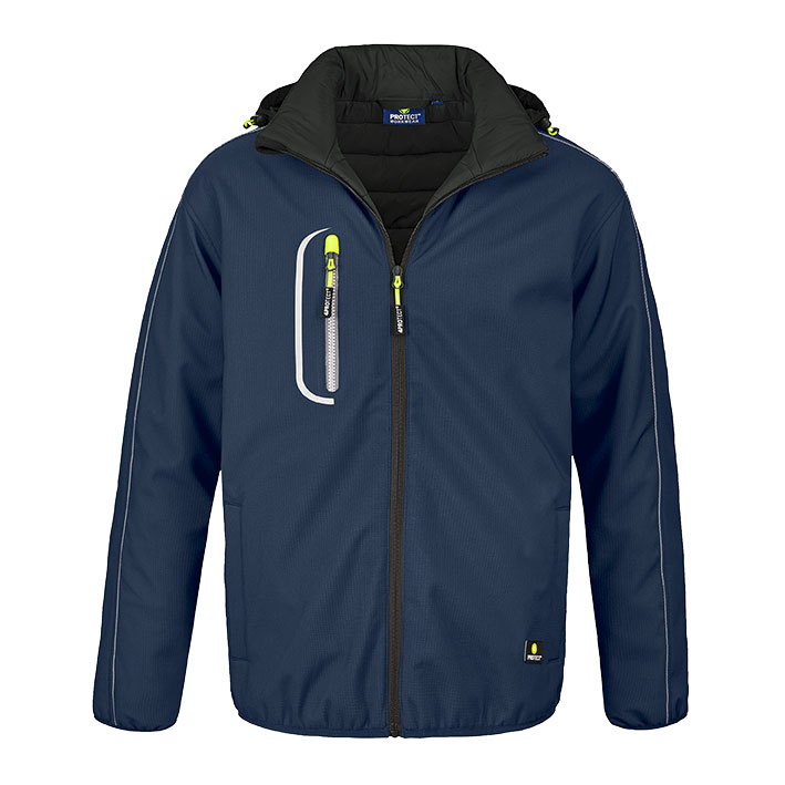 Garantiert wärmend und windabweisend bei geringem Gewicht. Die eingearbeitete Funktionsmembran garantiert eine hohe Wasserdichtigkeit bei gleichzeitig guter Atmungsaktivität des Gewebes. Die wärmende, gesteppte Innenwattierung in Kombination mit der Fleece-Innenseite schützt den Körper vor Auskühlung. Das Ripstop-Gewebe ist besonders reißfest und verhindert bei kleineren Rissen ein Weiterreißen. Abzippbare Kapuze mit drei Verstelloptionen. Strukturierte Reflexpaspel auf Vorder- und Rückenteil, unterlegter Frontreißverschluss mit Kinnschutz, elastische Ärmelabschlüsse. 1 Brusttasche mit wasserdichtem Reflex-Reißverschluss und Zipper-Garage, 2 untere Eingrifftaschen mit Handwärmefutter. Elastischer Saumabschluss, wattierter Kragen. Aufwendige Innenverarbeitung mit großer Kapuzen-, Innen- und Handytasche.