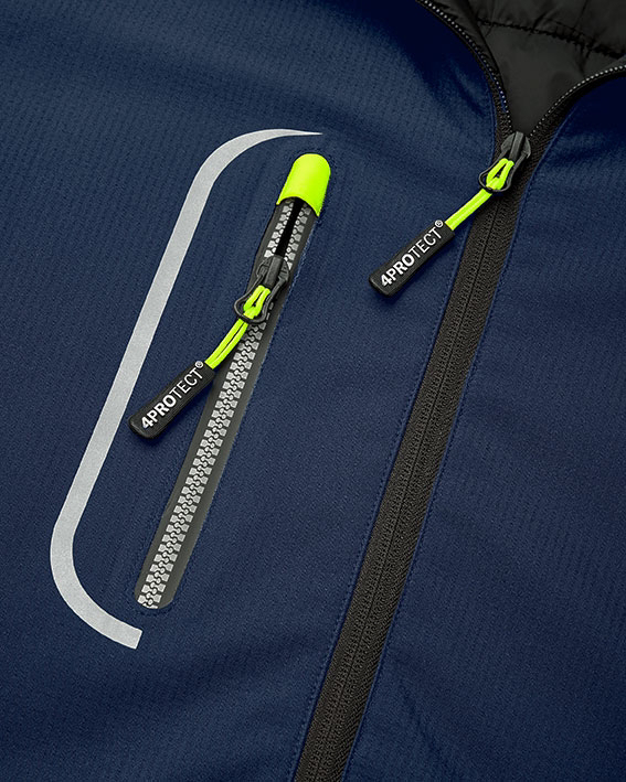 Garantiert wärmend und windabweisend bei geringem Gewicht. Die eingearbeitete Funktionsmembran garantiert eine hohe Wasserdichtigkeit bei gleichzeitig guter Atmungsaktivität des Gewebes. Die wärmende, gesteppte Innenwattierung in Kombination mit der Fleece-Innenseite schützt den Körper vor Auskühlung. Das Ripstop-Gewebe ist besonders reißfest und verhindert bei kleineren Rissen ein Weiterreißen. Abzippbare Kapuze mit drei Verstelloptionen. Strukturierte Reflexpaspel auf Vorder- und Rückenteil, unterlegter Frontreißverschluss mit Kinnschutz, elastische Ärmelabschlüsse. 1 Brusttasche mit wasserdichtem Reflex-Reißverschluss und Zipper-Garage, 2 untere Eingrifftaschen mit Handwärmefutter. Elastischer Saumabschluss, wattierter Kragen. Aufwendige Innenverarbeitung mit großer Kapuzen-, Innen- und Handytasche.