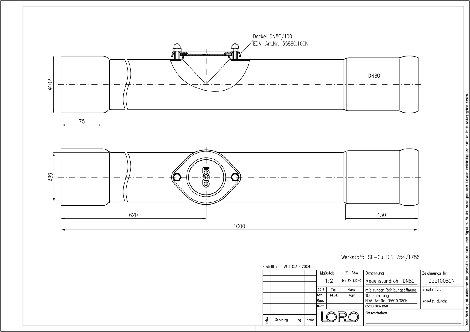 DN 80, 1m, Öffn., Kupfer