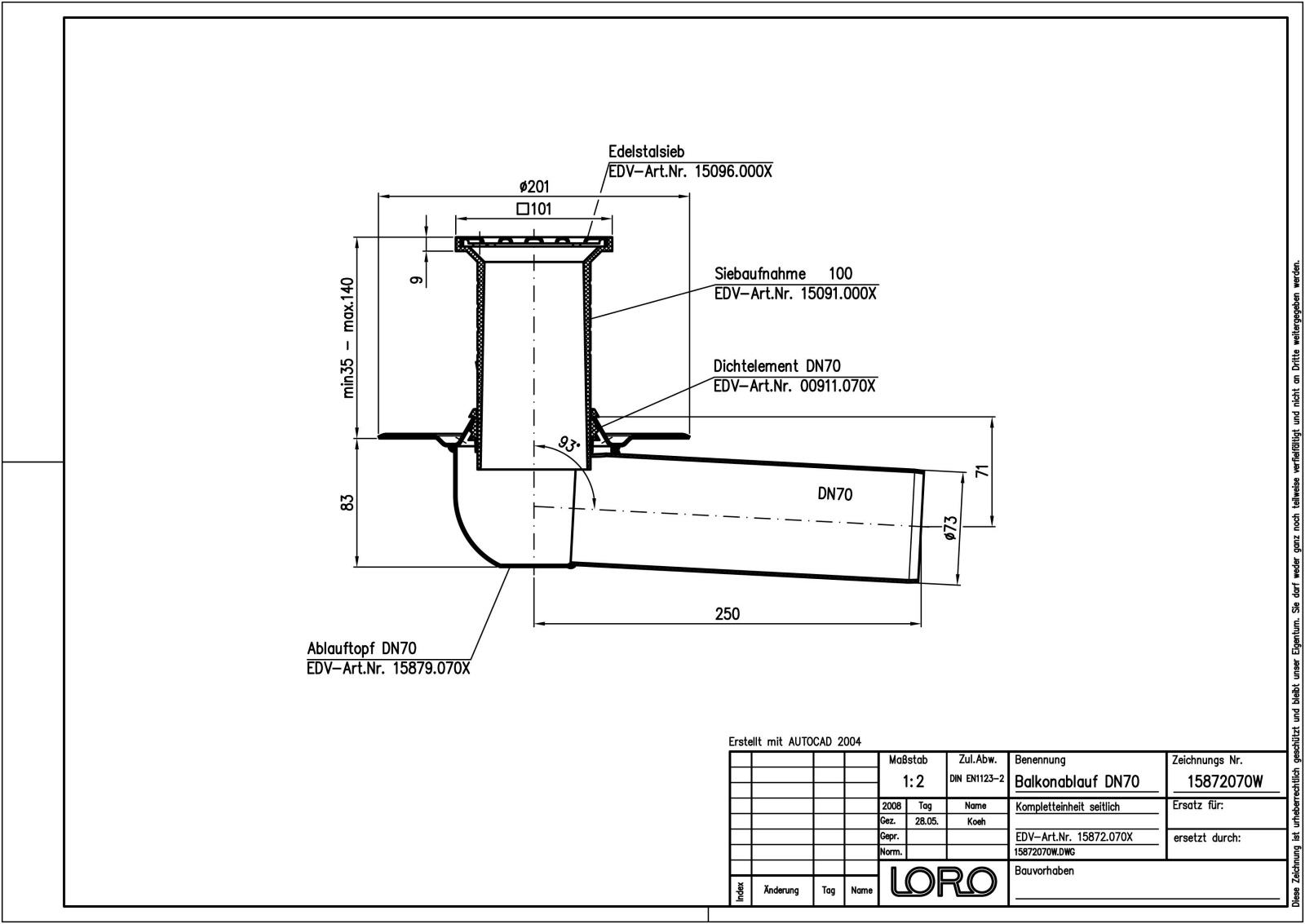 LORO-X Balkonablauf, Serie B mit Stützrand, einteilig ohne Wärmedämmung, Auslauf seitlich 3 Grad, nach DIN EN 1253 mit erhöhtem Qualitätsstandard gemäß RAL-Gütezeichen GZ-694, aus Stahl feuerverzinkt, mit langlebiger Beschichtung gemäß DIN EN ISO 2178 auf Basis einer 2K-Epoxid-Kombination, Farbton: Rotbraun, bestehend aus: bestehend aus Ablauftopf (Stützrandbreite 35 mm umlaufend), Dichtelement, Siebaufnahme 100 x 100 mm (für Aufbauhöhe 35 - 140 mm), Edelstahlsieb, DN 70