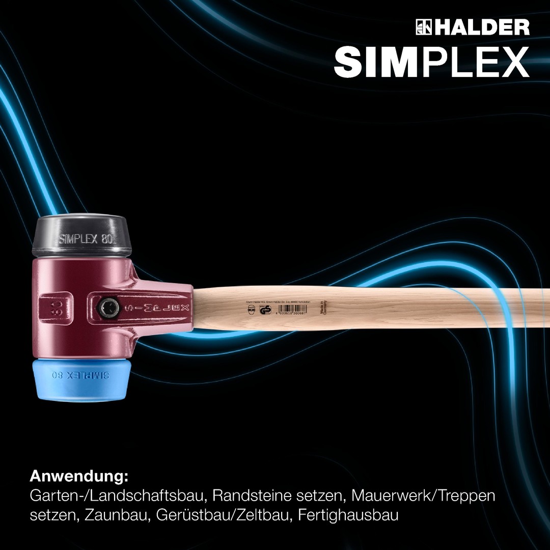 - SIMPLEX-Schonhammer in der Einsatzkombination TPE-soft (blau, weich, abriebfrei) / Gummikomposition (schwarz, mittelhart, dämpfend, geruchsneutral, verschleißarm).