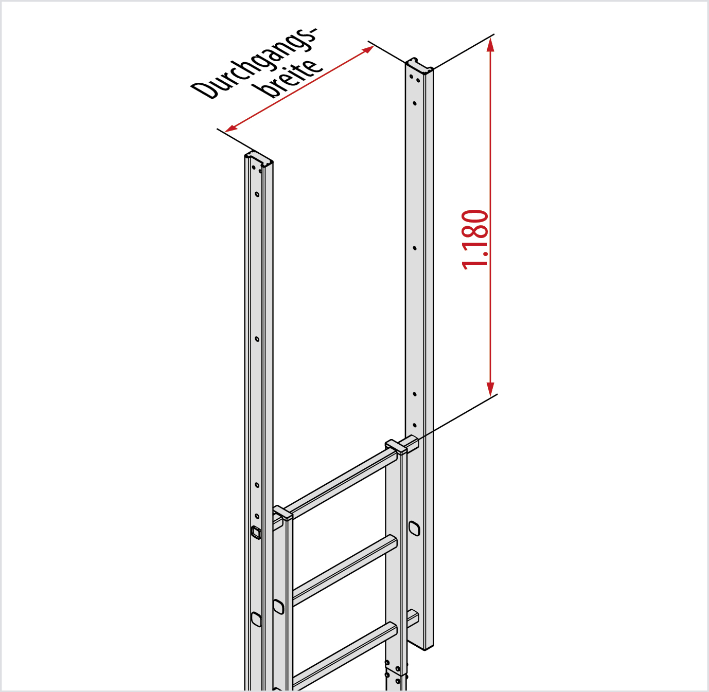 - Nach DIN 18799-1 bauliche Anlagen: Zusätzlicher Ausstiegstritt (Best.-Nr. 0054038 bzw. 0054039) erforderlich