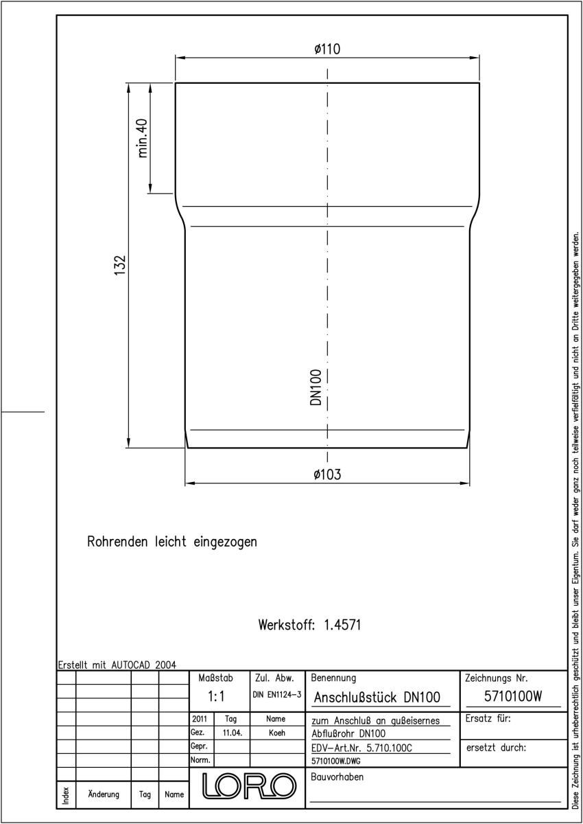 LORO-XCL Anschlussstücke, aus Edelstahl, Werkstoff Nr. 1.4571, gebeizt und passiviert, zum Übergang von SML-Rohr an LORO-XCL Muffe, nach DIN EN 1124 mit erhöhtem Qualitätsstandard gemäß RAL-Gütezeichen GZ-694, mit 2-Kammern-Steckmuffenverbindung, Baustoffklasse A1, formstabil, bruchfest, rückstausicher, DN 100