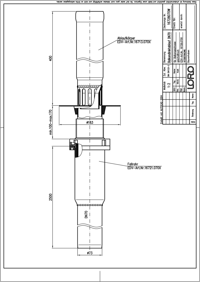 LORO-X VERSAL Balkondirektablauf, Serie J mit Stützrand, einteilig ohne Wärmedämmung, Auslauf senkrecht, nach DIN EN 1253 mit erhöhtem Qualitätsstandard gemäß RAL-Gütezeichen GZ-694, aus Stahl feuerverzinkt, mit langlebiger Beschichtung gemäß DIN EN ISO 2178 auf Basis einer 2K-Epoxid-Kombination, Farbton: Rotbraun, bestehend aus Ablaufkörper mit Langmuffe, Anschlussgewinde und konischer Dichtung, Fallrohrlänge 2500 mm, für Deckenstärke 40 - 170 mm, für Balkongeschosse, DN 70