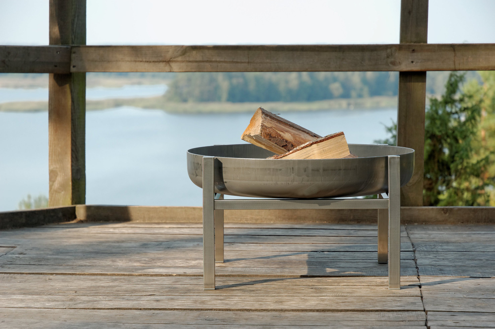 Überaus attraktive Feuerschale: die Kombination soliden, rostenden  Rohstahls (Materialstärke 3,2 mm) mit einer zeitlosen Edelstahl-Basis bietet auch ohne Befeuerung einen tollen Blickfang. Diese solide Feuerschale wird in einer europäischen Designer-Werkstatt weitgehend in Handarbeit hergestellt und entspricht höchsten Qualitätsansprüchen.
