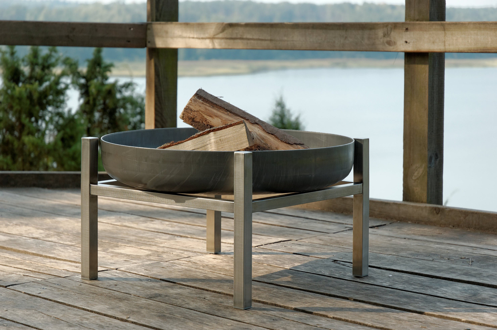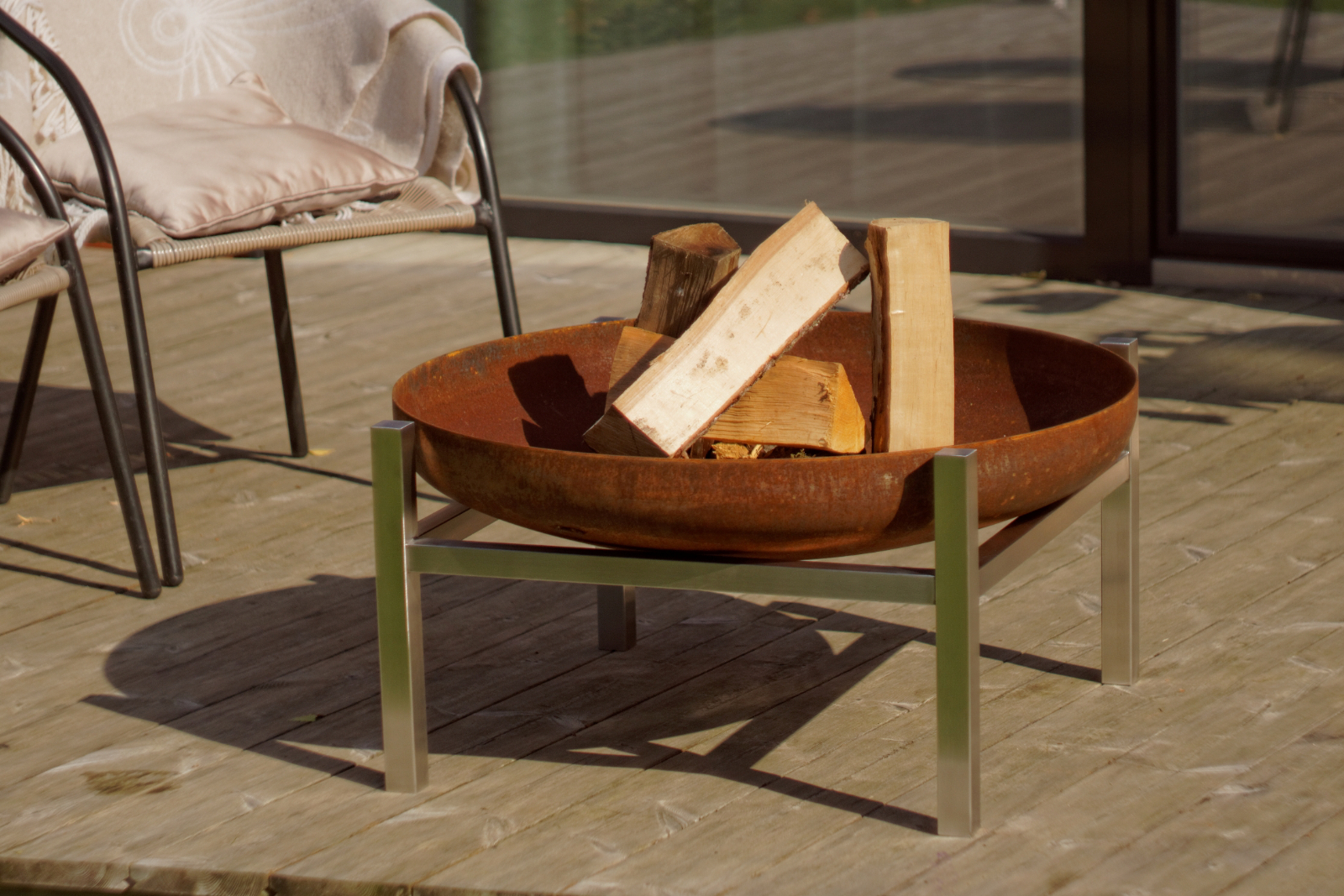 Überaus attraktive Feuerschale: die Kombination soliden, rostenden Rohstahls (Materialstärke 3,2 mm) mit einer zeitlosen Edelstahl-Basis bietet auch ohne Befeuerung einen tollen Blickfang. Diese solide Feuerschale wird in einer europäischen Designer-Werkstatt weitgehend in Handarbeit hergestellt und entspricht höchsten Qualitätsansprüchen.