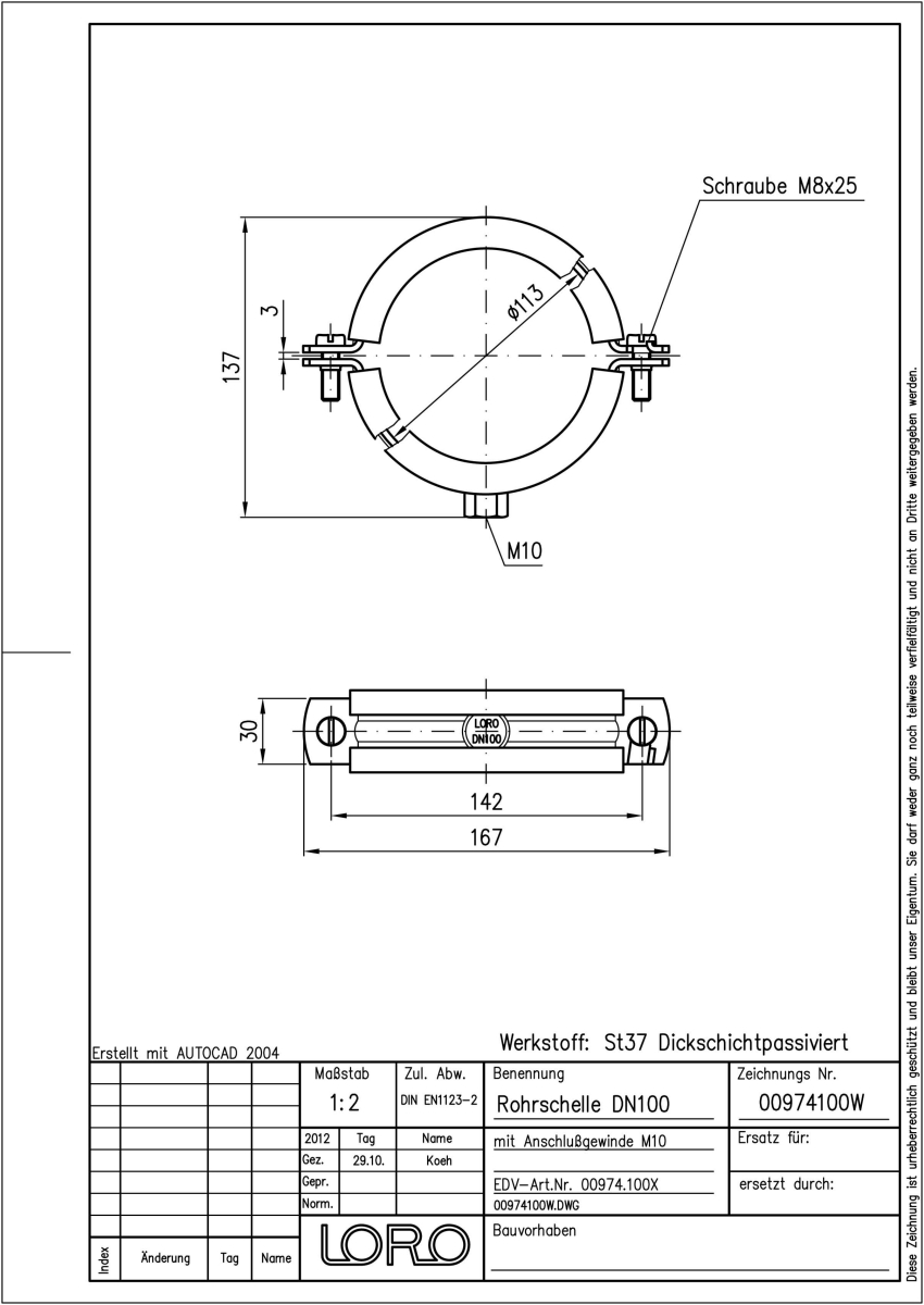 LORO-X Rohrschelle, aus Stahl, mit Anschlussgewinde M 10/12, mit Schalldämmung, DN 100