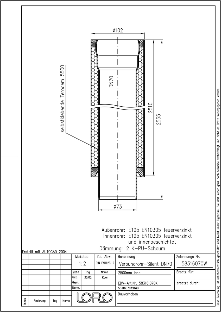 LORO-X Verbundrohr, Ausführung SILENT, für erhöhte Schalldämmung, bestehend aus: Innenrohr (LORO-X Rohr, aus Stahl, feuerverzinkt, nach DIN EN 1123, mit erhöhtem Qualitätsstandard gemäß RAL-Gütezeichen GZ-694, mit 2-Kammern-Steckmuffenverbindung, Baustoffklasse A1, formstabil, bruchfest, rückstausicher, langlebige Innenbeschichtung gemäß DIN EN ISO 2178 auf Basis einer 2K-Epoxid-Kombination, Farbton: Rotbraun), Schallschutzmatte (am Innenrohr angebracht), Dämmschicht (PU-Hartschaum B2, FCKW-frei) und Außenrohr (LORO-X Rohr, feuerverzinkt) 2500 mm lang, DN 70