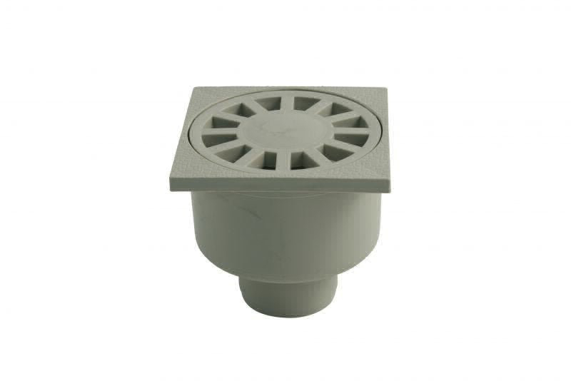 Haus- und Hofablauf mit Kunststoffrost, grau, schlagfest, temperaturbeständiger, säure- und laugenbeständiger Kunststoff aus PP (Polypropylen), senkrechter Anschluss an HT/KG (Muffe), mit Geruchsverschluss.