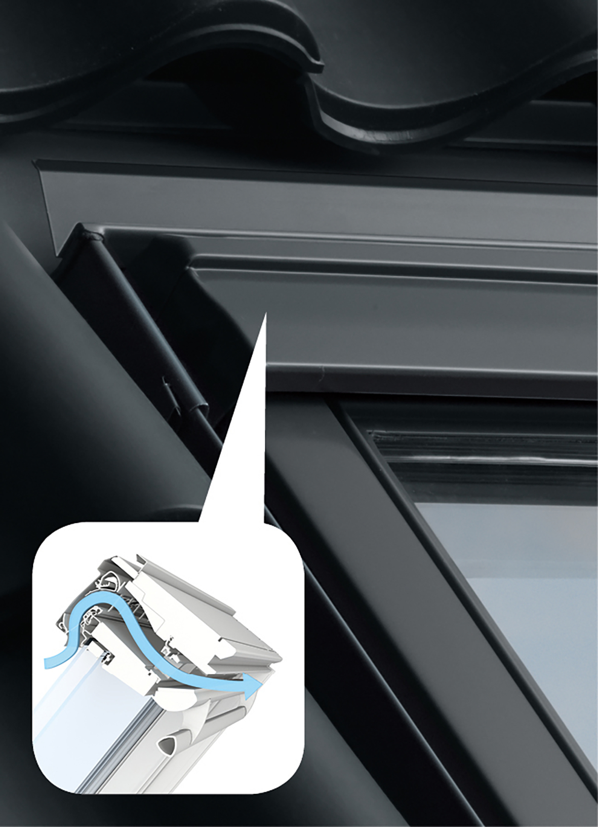 VELUX Balanced Ventilation nutzt Wind und Temperaturunterschiede und sorgt ganz einfach über die VELUX Lüftungsklappe bei geschlossenem Fenster für effiziente freie Querlüftung bei nahezu jeder Wetterlage, auch in windarmen Regionen: