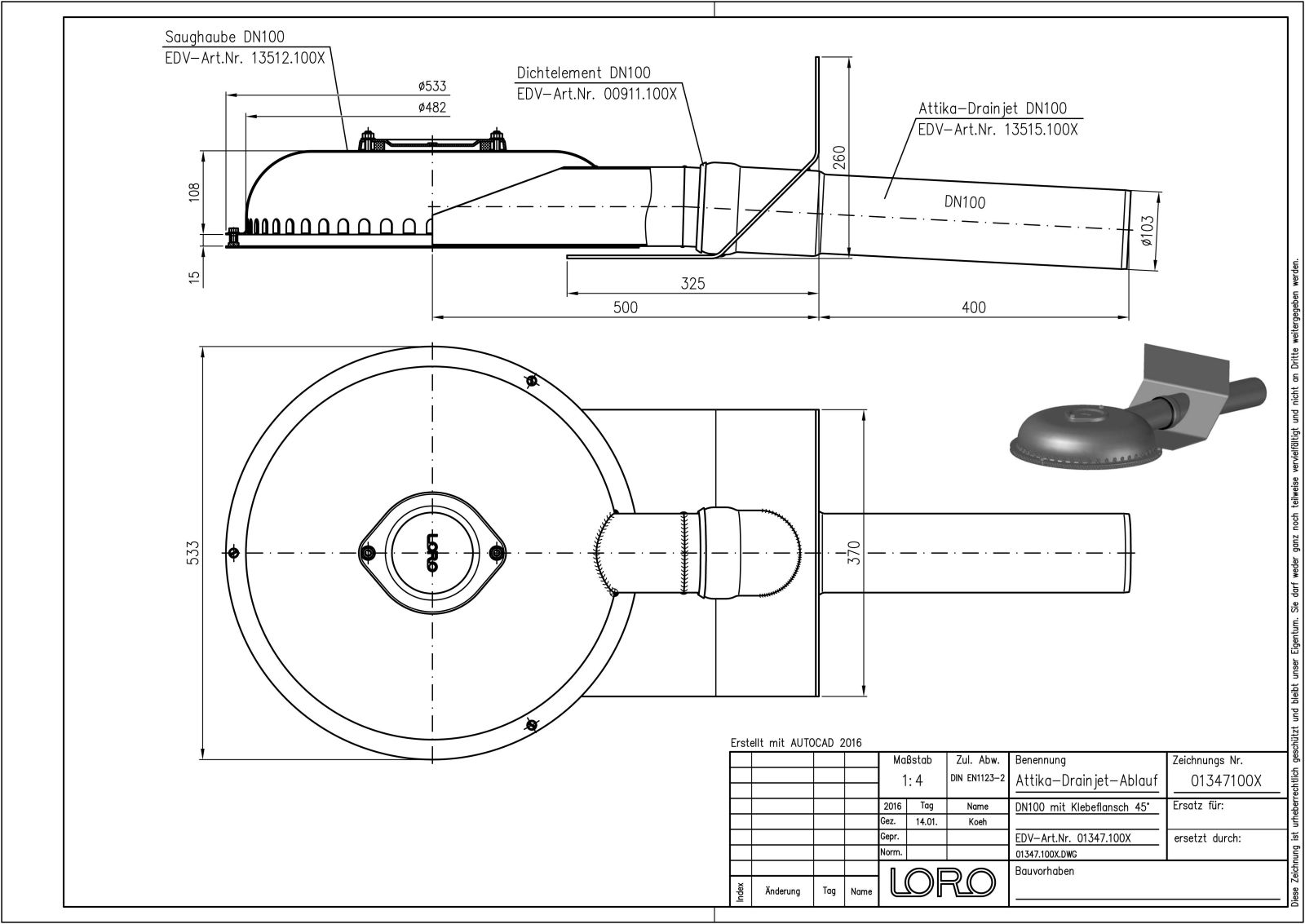 LORO-X DRAINJET Attika-Schnellablauf, Serie 62 ohne Eingriff ins Dach, für Hauptentwässerung mit Druckströmung, Abflussleistung 38,0 l/s bei 55 mm Wasserhöhe auf dem Dach, mit Klebeflansch, 45 Grad Aufkantung für Bitumen-Abdichtungsbahnen, Eingrifftiefe 0 mm, nach DIN EN 1253, Leistungsnachweis mit normgerechtem Prüfsystem mit 4,2m nicht belüfteter Fallleitung gemäß Systemdatenblatt LX1158, aus Edelstahl, DN 100