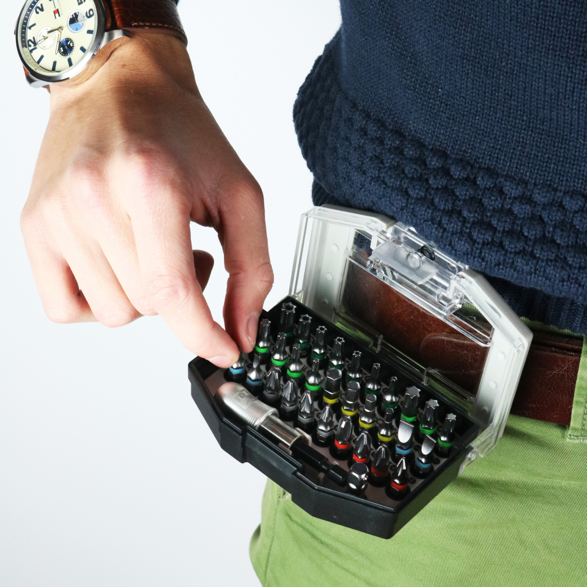 - Bit-Box ist eine 32-teilige, stabile, handliche Kunststoffbox mit Gürtelclip