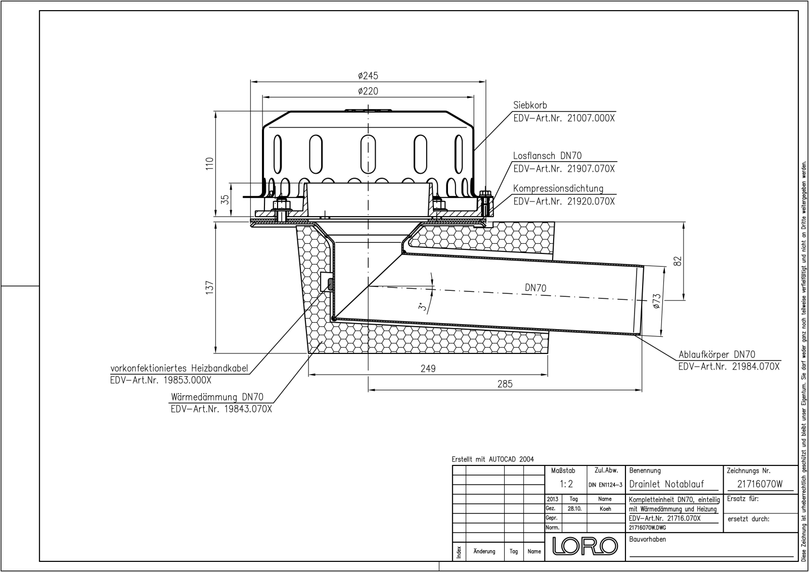 LORO-X DRAINLET Flachdachablauf, Serie 84(DL) einteilig mit Wärmedämmung und Heizung, Auslauf seitlich 3 Grad, für Notentwässerung mit Freispiegelströmung, Abflussleistung 10,0 l/s bei 75 mm Wasserhöhe auf dem Dach, mit Klemmflansch als Los- und Festflanschkonstruktion inklusive Kompressionsdichtungen, für Bitumen und Kunststoff Abdichtungsbahnen, DRAINLET-Haube aus Edelstahl, nach DIN EN 1253 mit erhöhtem Qualitätsstandard gemäß RAL-Gütezeichen GZ-694, Leistungsnachweis mit normgerechtem Prüfsystem mit 4,2m nicht belüfteter Fallleitung gemäß LX-Datenblatt LX889, aus Edelstahl, DN 70