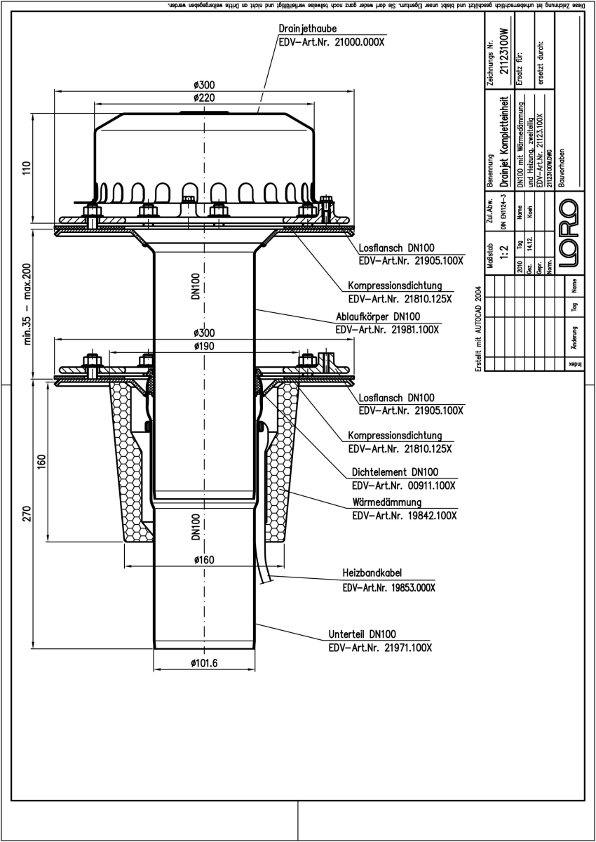 LORO-X DRAINJET Flachdach-Schnellablauf, Serie 49(DJ) zweiteilig mit Wärmedämmung und Heizung, Auslauf senkrecht, für Hauptentwässerung mit Druckströmung, Abflussleistung 27,0 l/s bei 55 mm Wasserhöhe auf dem Dach, mit Klemmflansch als Los- und Festflanschkonstruktion inklusive Kompressionsdichtungen, für Bitumen- und Kunststoff- Abdichtungsbahnen, DRAINJET-Haube aus Edelstahl, nach DIN EN 1253 mit erhöhtem Qualitätsstandard gemäß RAL-Gütezeichen GZ-694, Leistungsnachweis mit normgerechtem Prüfsystem mit 4,2m nicht belüfteter Fallleitung gemäß LX-Datenblatt LX530, aus Edelstahl, DN 100