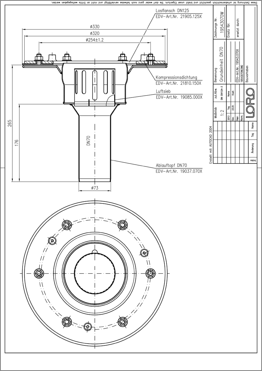 LORO-VERSAL Schnellablauf-Grundeinheit, für Druckströmung mit planmäßiger Vollfüllung, nach DIN EN 1253 mit erhöhtem Qualitätsstandard gemäß RAL-Gütezeichen, mit Klemmflansch als Fest- und Losflanschkonstruktion, aus Edelstahl, ohne Wärmedämmung, bestehend aus Ablauftopf, Luftsieb und Losflansch, DN 70