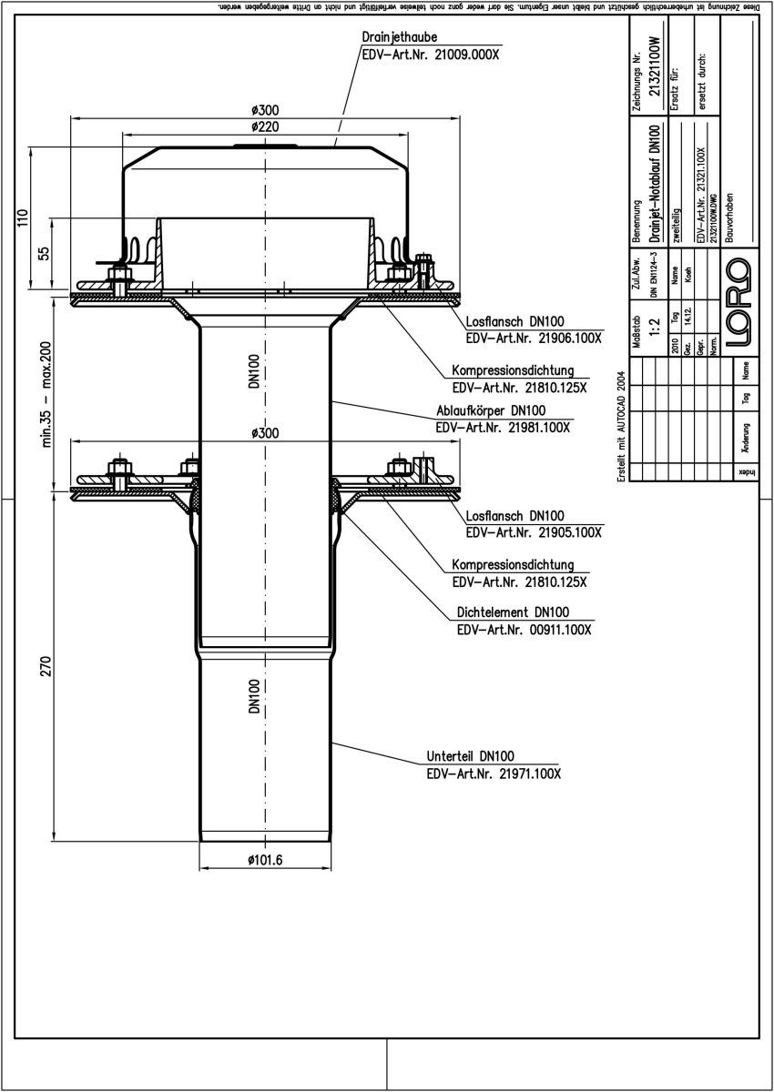 LORO-X DRAINJET Flachdach-Schnellablauf, Serie 49(DJ) zweiteilig ohne Wärmedämmung, Auslauf senkrecht, für Notentwässerung mit Druckströmung, Abflussleistung 38,0 l/s bei 75 mm Wasserhöhe auf dem Dach, mit Klemmflansch als Los- und Festflanschkonstruktion inklusive Kompressionsdichtungen, für Bitumen und Kunststoff Abdichtungsbahnen, DRAINJET-Haube aus Edelstahl, nach DIN EN 1253 mit erhöhtem Qualitätsstandard gemäß RAL-Gütezeichen GZ-694, Leistungsnachweis mit normgerechtem Prüfsystem mit 4,2m nicht belüfteter Fallleitung gemäß LX-Datenblatt LX542, aus Edelstahl, DN 100