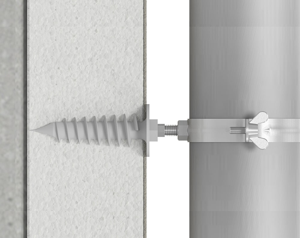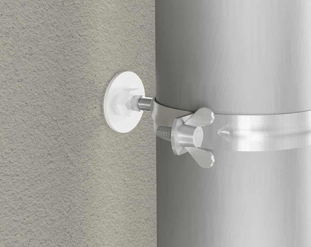 Der Isolationsdübel mit Stockschraube A2 von Eurotec dient der Befestigung von beispielsweise Regenfallrohren. Dadurch werden Wärmebrücken an der Fassade verhindert.