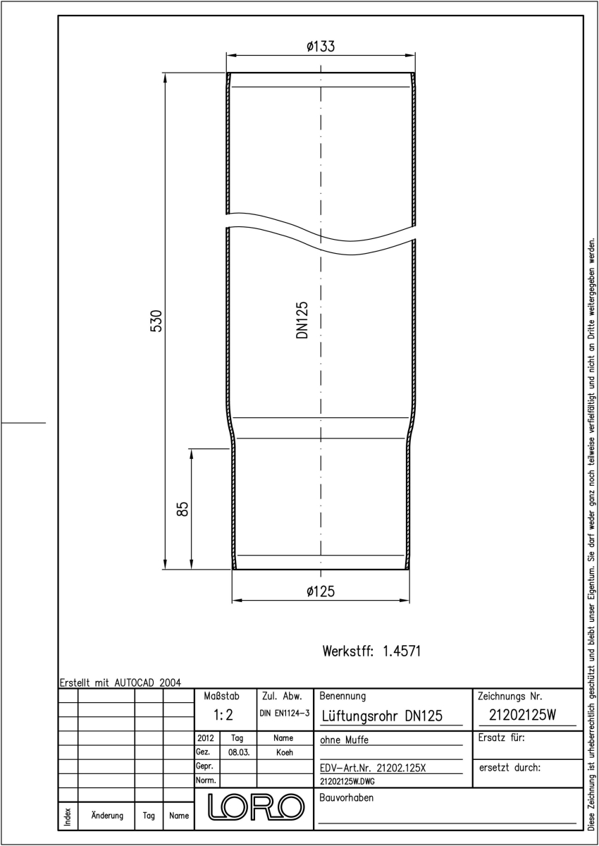 LORO-XC Lüftungsrohr, aus Edelstahl 1.4301, DN 125