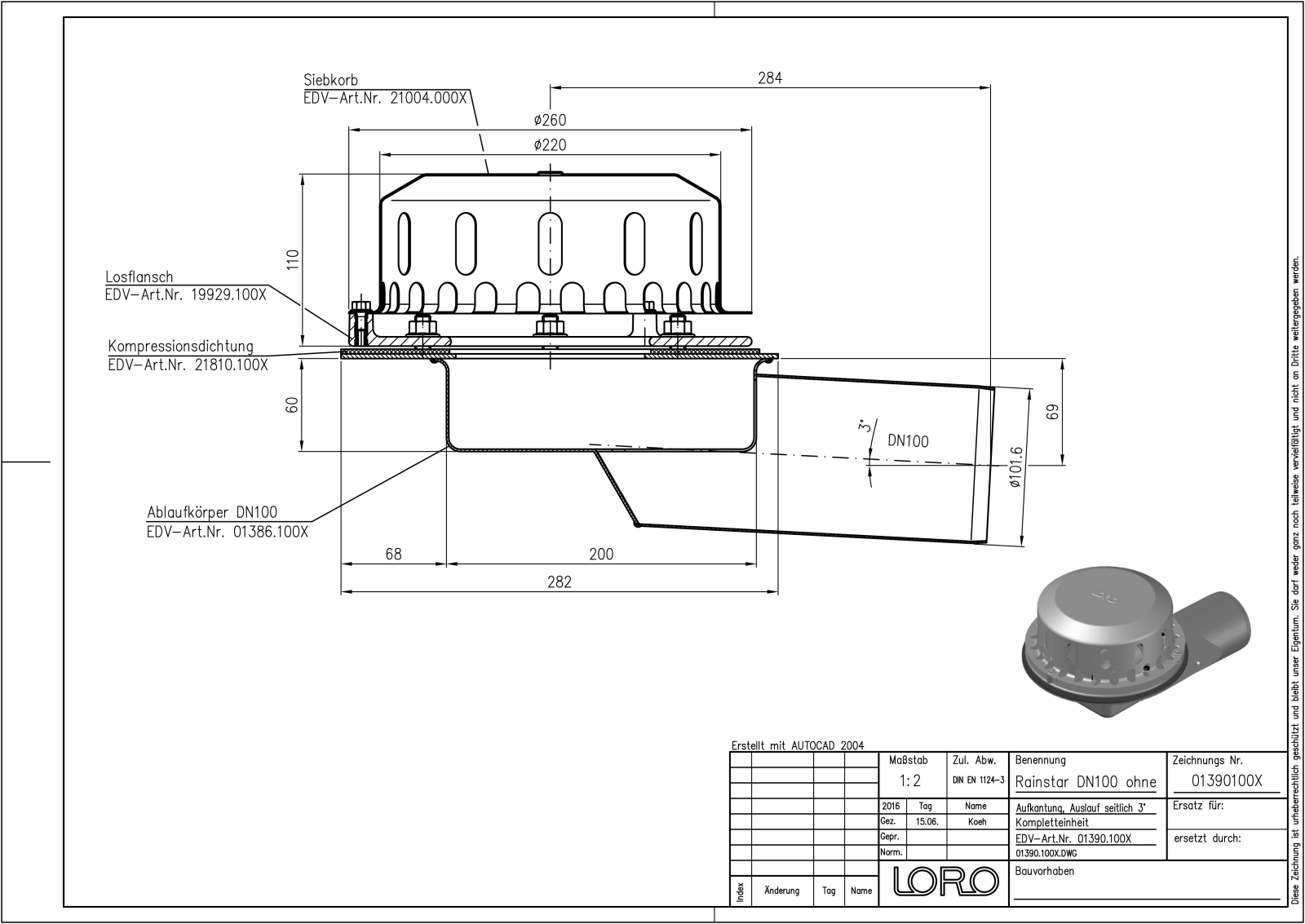 LORO-X RAINSTAR Attikaablauf, Serie 88 ohne Aufkantung, für Hauptentwässerung mit Freispiegelströmung, Abflussleistung 5,4 l/s bei 35 mm Wasserhöhe auf dem Dach, mit Klemmflansch, als Los- und Festflanschkonstruktion, ohne Aufkantung für Bitumen- und Kunststoff-Abdichtungsbahnen, Eingrifftiefe 106 mm, mit DRAINLET-Haube aus Edelstahl, nach DIN EN 1253, Leistungsnachweis mit normgerechtem Prüfsystem mit 4,2m nicht belüfteter Fallleitung gemäß Systemdatenblatt LX479, aus Edelstahl, DN 100