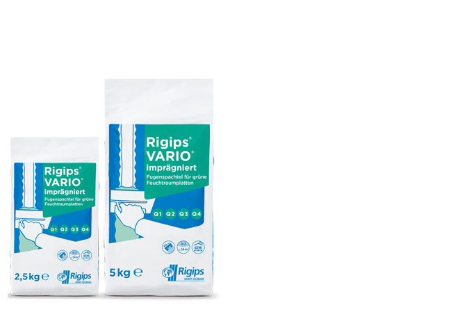 Der VARIO imprägniert von Rigips ist ein grünes, hydrophobiertes und hoch kunststoffvergütetes Fugenspachtelmaterial gemäß DIN EN 13963/Typ 4B. Er eignet sich speziell für die Verspachtelung der Fugen und Anschlüsse von imprägnierten Gipsplatten. Je nach Fugenausbildung kann er mit oder ohne Rigips Bewehrungsstreifen verarbeitet werden. Auch zur vollflächigen Nachspachtelung geeignet.
