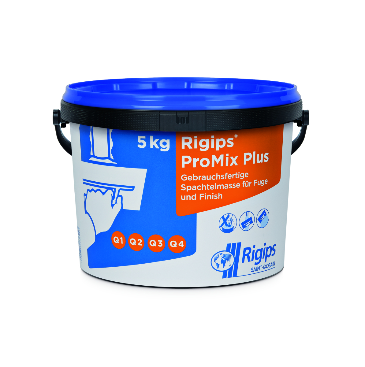 Der ProMix Plus von Rigips ist eine gebrauchsfertige, manuell und maschinell verarbeitbare Feinspachtelmasse nach DIN EN 13963/Typ 3A für das Füllen von Fugen von Gipsplatten in Verbindung mit dem Rigips Papierbewehrungsstreifen und für das Fugen- und Oberflächenfinish auf Gipskartonoberflächen, Beton, und anderen Untergründen. Geschmeidige und gleichbleibende Konsistenz, hohe Fugenfestigkeit.