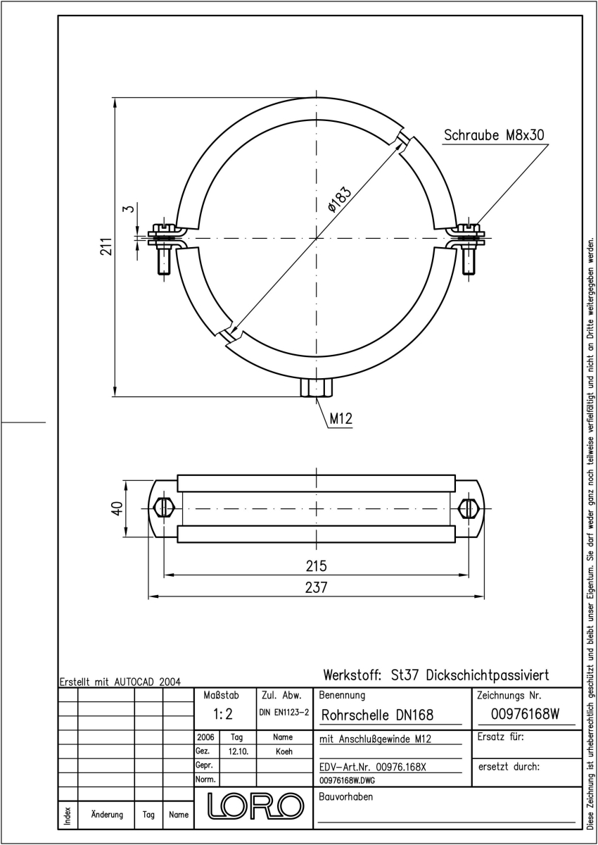 LORO-X Rohrschelle, aus Stahl, mit Anschlussgewinde M 12, mit Schalldämmung, DN 168