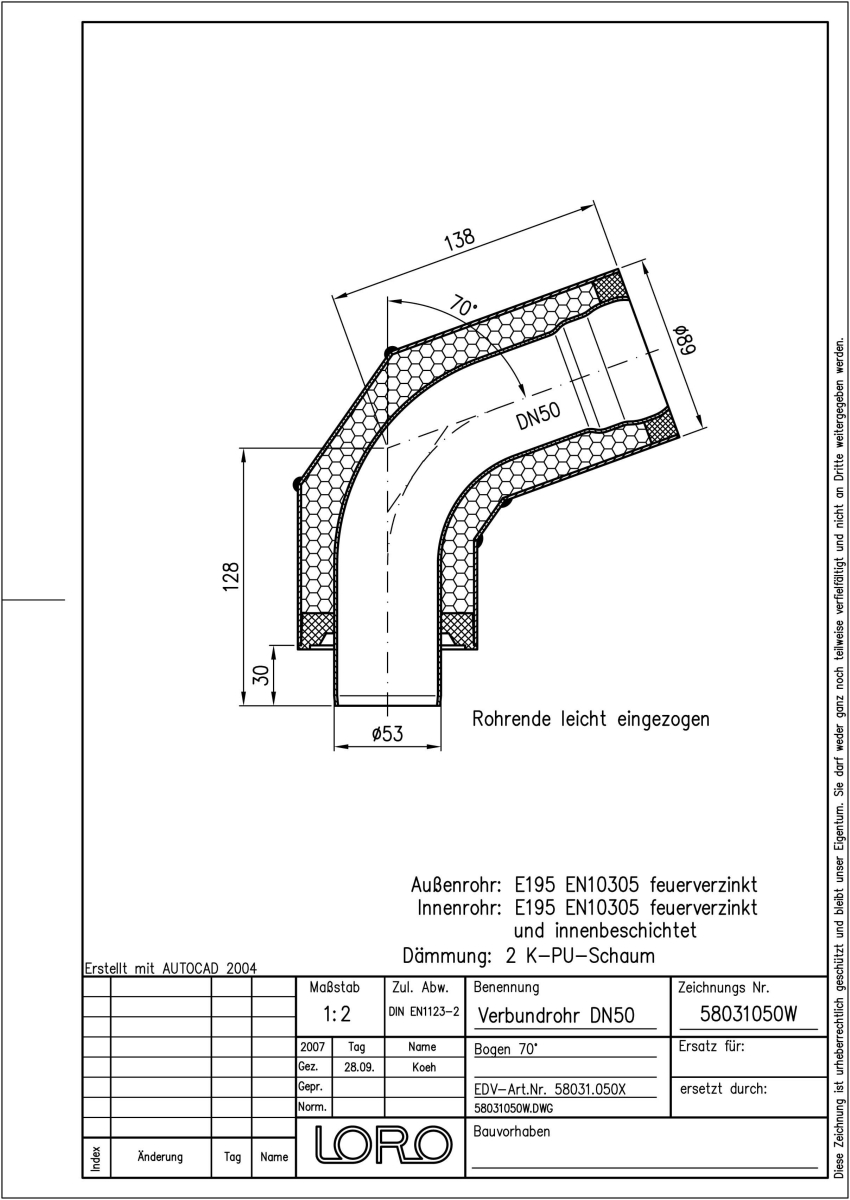LORO-X Verbundrohr-Bogen, bestehend aus Innenrohr (LORO-X Rohr, aus Stahl, feuerverzinkt, nach DIN EN 1123, mit erhöhtem Qualitätsstandard gemäß RAL-Gütezeichen GZ-694, mit 2-Kammern-Steckmuffenverbindung, Baustoffklasse A1, formstabil, bruchfest, rückstausicher, langlebige Innenbeschichtung gemäß DIN EN ISO 2178 auf Basis einer 2K-Epoxid-Kombination, Farbton: Rotbraun), Dämmschicht (PU-Hartschaum B2, FCKW-frei) und Außenrohr (LORO-X Rohr, feuerverzinkt), 70 Grad, DN 50