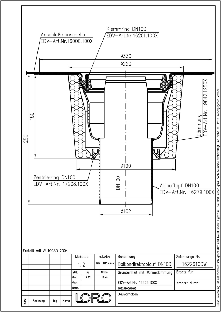 LORO-Balkondirektablauf-Grundeinheit, mit Anschlussmanschette aus Bitumen/EPDM-Verund, Serie H, nach DIN EN 1253, aus Stahl, feuerverzinkt, , langlebige Innenbeschichtung gemäß DIN EN ISO 2178 auf Basis einer 2K-Epoxid-Kombination, Farbton: Rotbraun, Auslauf senkrecht, mit Fallrohrlänge 250 mm, mit Wärmedämmung, bestehend aus Ablauftopf, Anschlussmanschette, Klemmring ohne Entwässerungsöffungen, DN 100