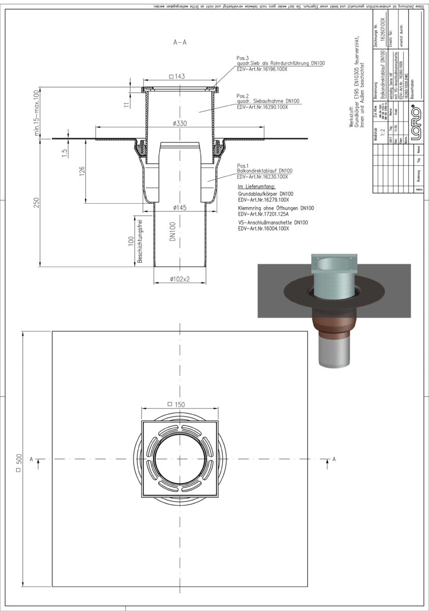 LORO-X Balkondirektablauf, Serie HF, einteilig ohne Wärmedämmung, Auslauf senkrecht, mit vormontierter VS-Anschlussmanschette aus Mehrlagen-Verbundwerkstoff, für Abdichtung mit Flüssigkunststoffen/Verbundabdichtungen, nach DIN EN 1253 mit erhöhtem Qualitätsstandard gemäß RAL-Gütezeichen GZ-694, aus Stahl feuerverzinkt, mit langlebiger Beschichtung gemäß DIN EN ISO 2178 auf Basis einer 2K-Epoxid-Kombination, Farbton: Rotbraun, bestehend aus Ablauftopf, VS-Anschlussmanschette, Klemmring, Siebaufnahme (für Aufbauhöhe 15 - 105 mm), Sieb für Rohrdurchführung für Balkongeschosse, DN 100
