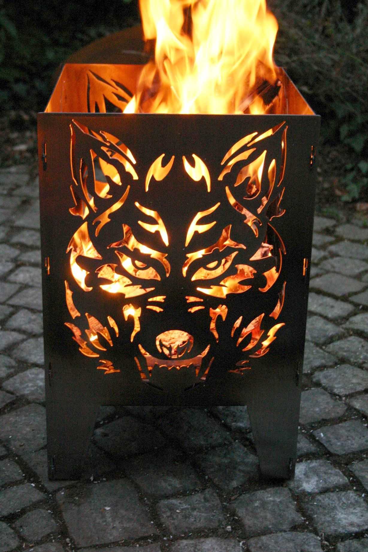 Feuerkorb Größe L Motiv Wolf aus Rohstahl - Stecksystem - mit Ascheblech und massiven integriertem Gitterrost