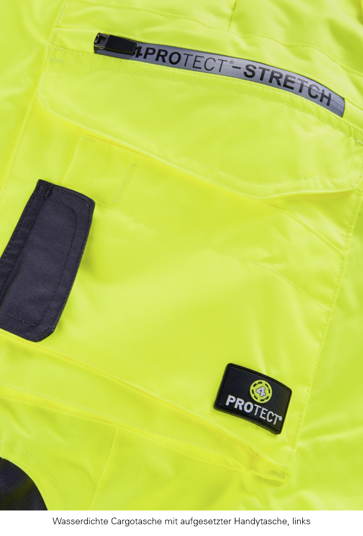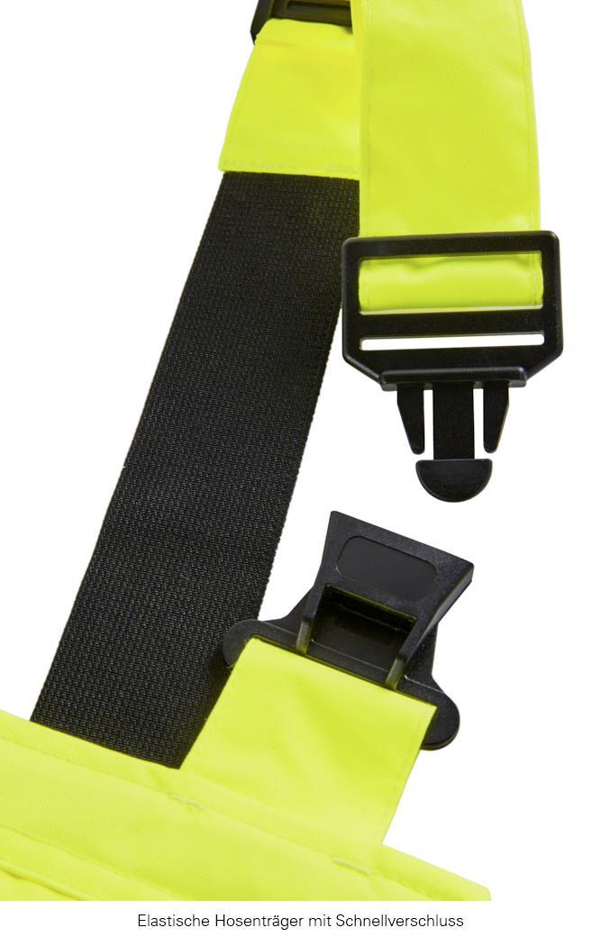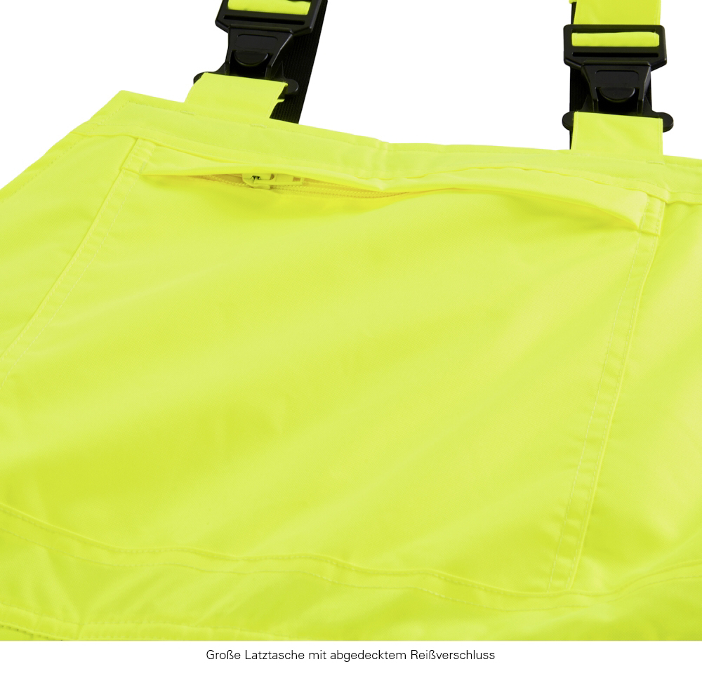 Zertifiziert nach EN ISO 13688:2013 (allgemeine Anforderungen), EN ISO 20471:2013+A1:2016 Klasse 2 (Warnschutz) und 343:2019 (Regenschutz). Wind- und wasserdichte Ausstattung. Segmentierte, auflaminierte extra breite Reflexstreifen (7 cm), umlaufend um die Beine, dunkel abgesetzter Saumbereich verhindert leichtes Anschmutzen. Elastischer Gummizug im Taillenbund. Seitliche Knöpfung und Beinnähte mit Reißverschlussöffnung in der Seitennaht erleichtern das Anziehen. Hosenschlitz mit Reißverschluss. Elastische Hosenträger mit Verstellschnallen. Kniepolster-Taschen, 1 Latztasche mit Reisverschluss, 2 Eingriffstaschen vorn, 1 große Cargotasche mit vorgesetzter Handy- und Stifttasche sowie 2 Gesäßtaschen am Rückteil. Warm wattiertes, gestepptes Innenfutter. Diese Bekleidung ist zusätzlich im System mit dem Knieschutz (Art. 8400) nach EN 14404:2010, Typ 2, Leistungsstufe 1 zertifiziert.