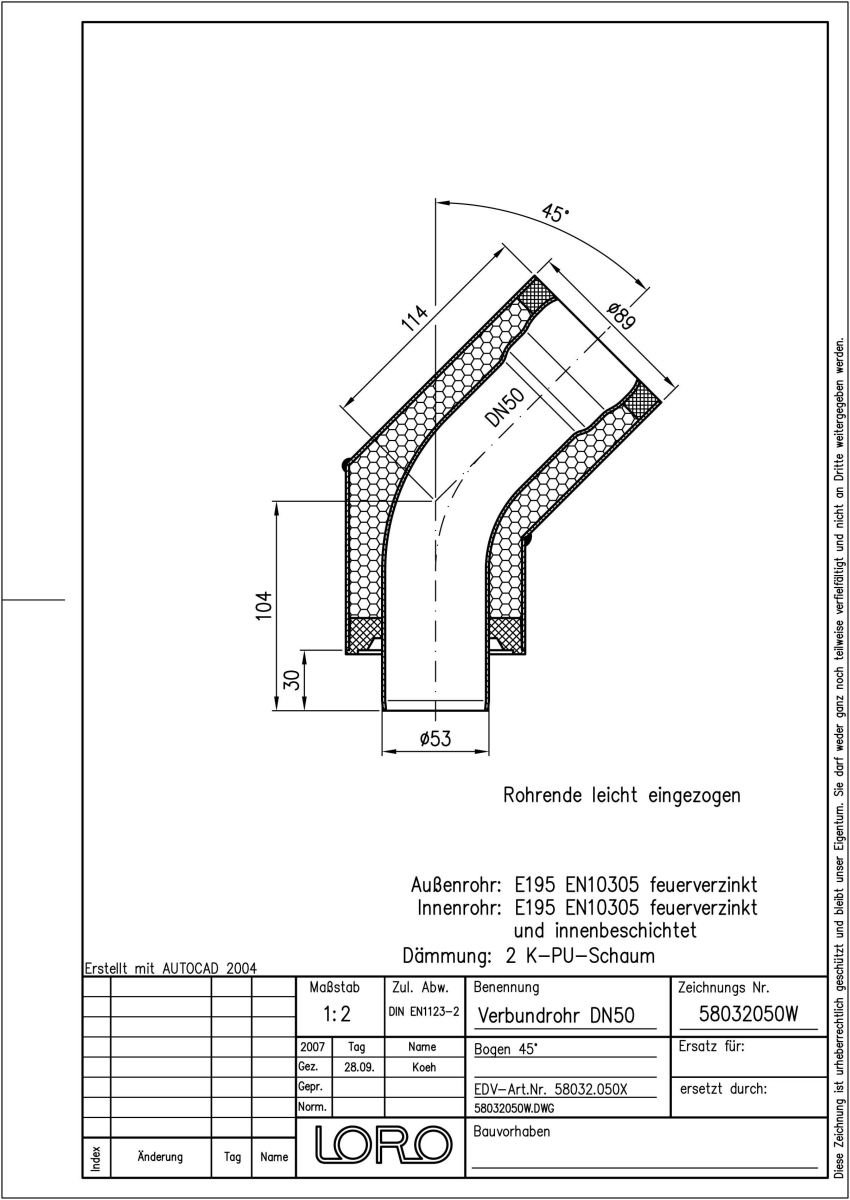 LORO-X Verbundrohr-Bogen, bestehend aus Innenrohr (LORO-X Rohr, aus Stahl, feuerverzinkt, nach DIN EN 1123, mit erhöhtem Qualitätsstandard gemäß RAL-Gütezeichen GZ-694, mit 2-Kammern-Steckmuffenverbindung, Baustoffklasse A1, formstabil, bruchfest, rückstausicher, langlebige Innenbeschichtung gemäß DIN EN ISO 2178 auf Basis einer 2K-Epoxid-Kombination, Farbton: Rotbraun), Dämmschicht (PU-Hartschaum B2, FCKW-frei) und Außenrohr (LORO-X Rohr, feuerverzinkt), 45 Grad, DN 50