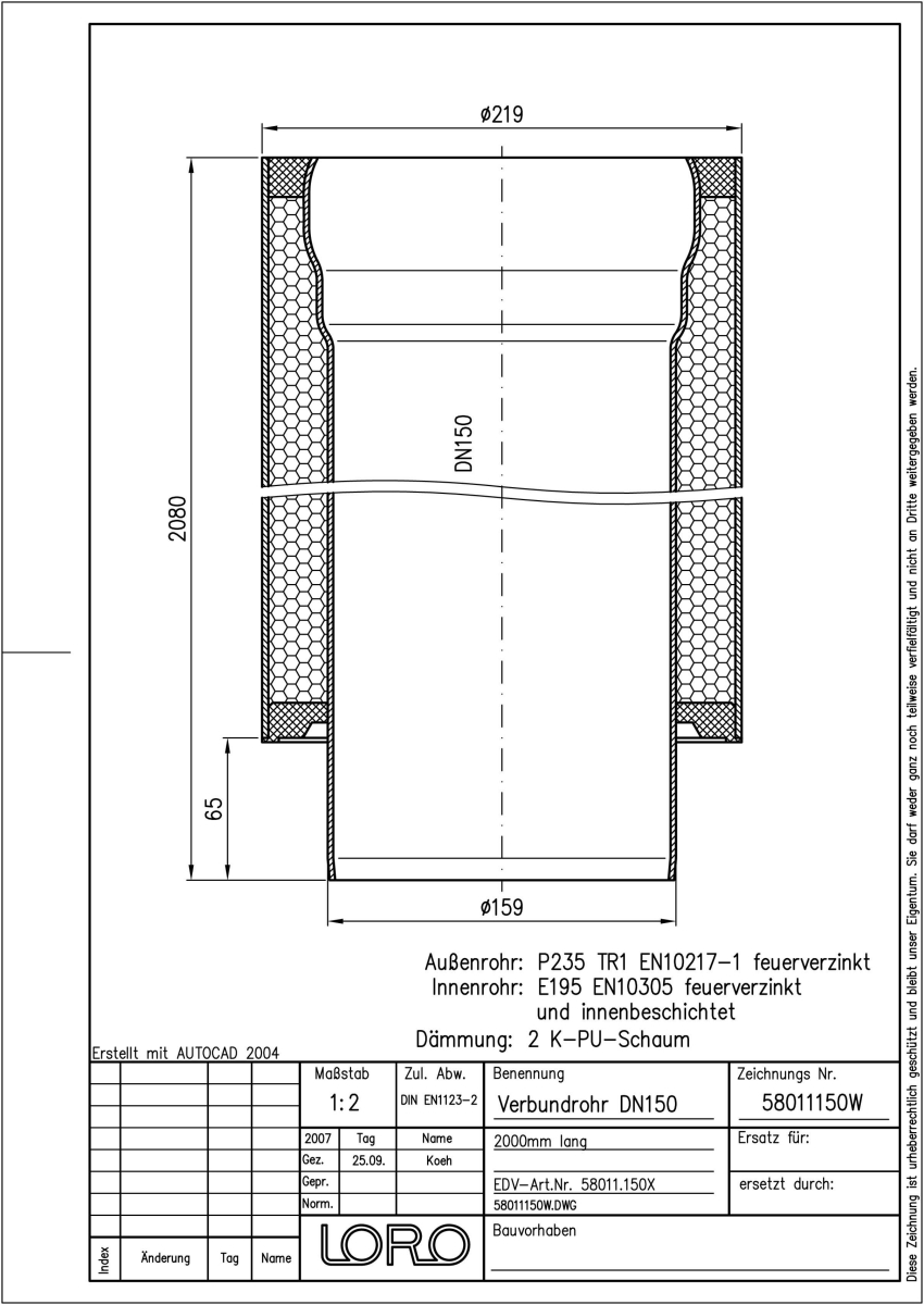 LORO-X Verbundrohr bestehend aus Innenrohr (LORO-X Rohr, aus Stahl feuerverzinkt, nach DIN EN 1123, mit erhöhtem Qualitätsstandard gemäß RAL-Gütezeichen GZ-694, mit 2-Kammern-Steckmuffenverbindung, Baustoffklasse A1, formstabil, bruchfest, rückstausicher, langlebige Innenbeschichtung gemäß DIN EN ISO 2178 auf Basis einer 2K-Epoxid-Kombination, Farbton: Rotbraun), Dämmschicht (PU-Hartschaum B2, FCKW-frei) und Außenrohr (LORO-X Rohr, aus Stahl, feuerverzinkt), 3000 mm lang, DN 150