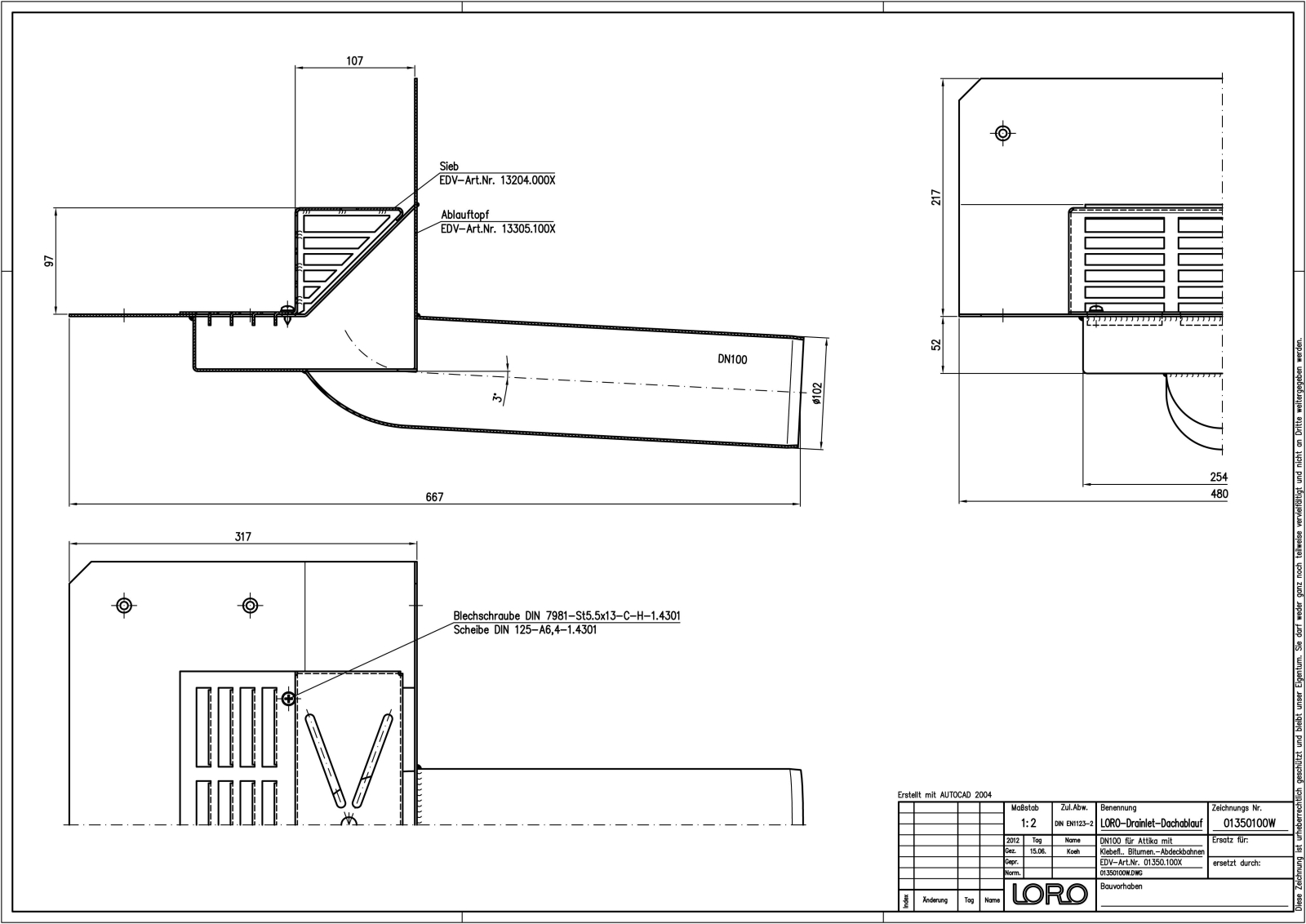 LORO-X Attikadirektablauf, Serie 43 mit Becken und tiefgelegtem Rohr, für Hauptentwässerung mit Freispiegelströmung, Abflussleistung 4,5 l/s bei 35 mm Wasserhöhe auf dem Dach, mit Klebeflansch, für Bitumen-Abdichtungsbahnen, Eingrifftiefe 103 mm, nach DIN EN 1253, Leistungsnachweis mit normgerechtem Prüfsystem mit 4,2m nicht belüfteter Fallleitung gemäß Systemdatenblatt LX694, aus Stahl, feuerverzinkt, DN 100