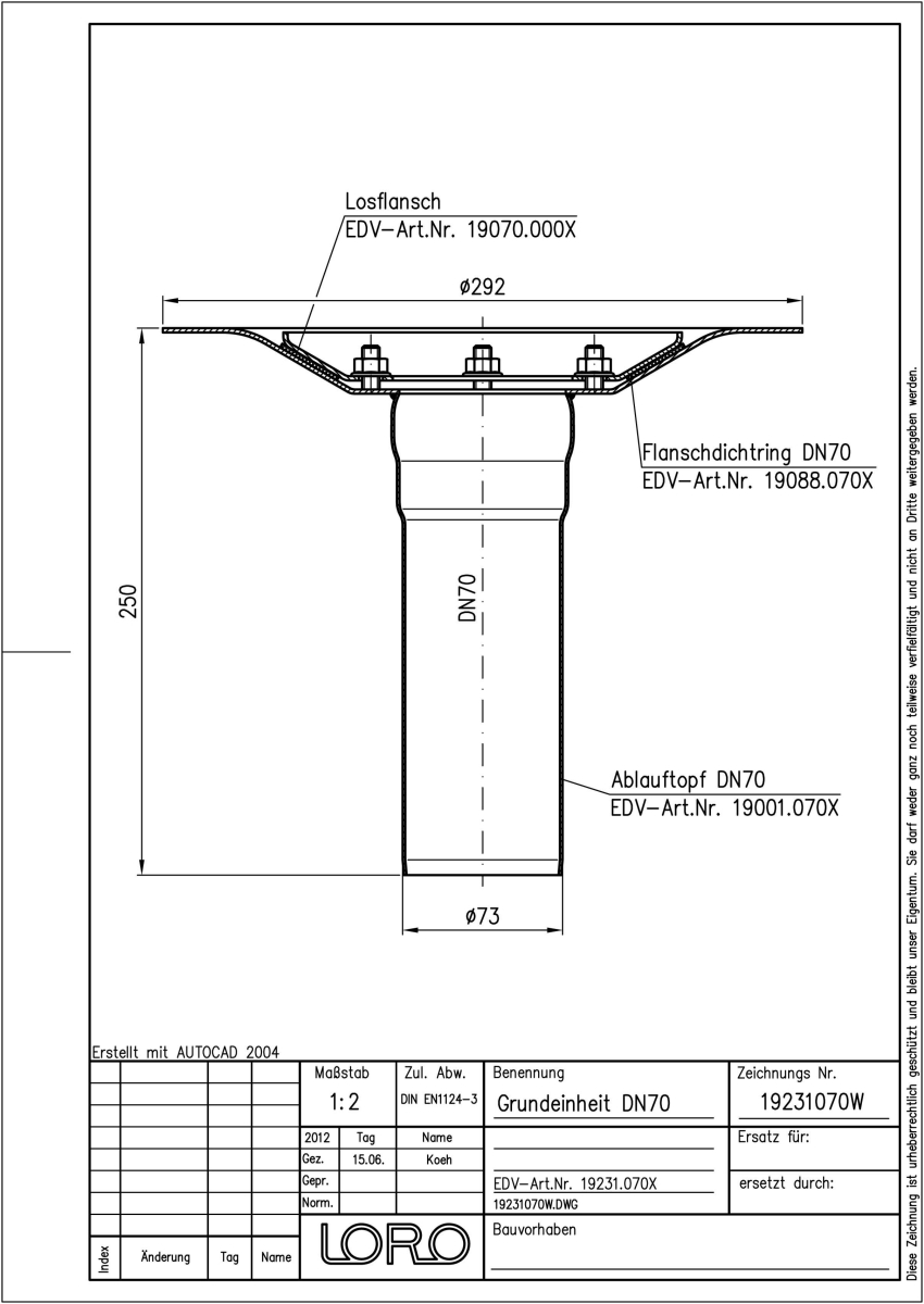 LORO-VERSAL Balkonablauf-Grundeinheit mit Klemmflansch, Serie K, nach DIN EN 1253 mit erhöhtem Qualitätsstandard gemäß RAL-Gütezeichen, aus Edelstahl, Auslauf senkrecht, ohne Wärmedämmung, bestehend aus Ablauftopf, Flanschdichtring, Losflansch, DN 70