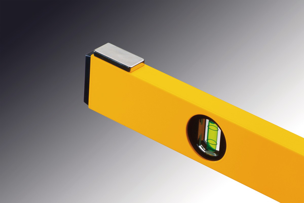 - Lange Aluminium-Rechteckprofil-Wasserwaage mit einer Messfläche aus zwei fest montierten Abstandhaltern.