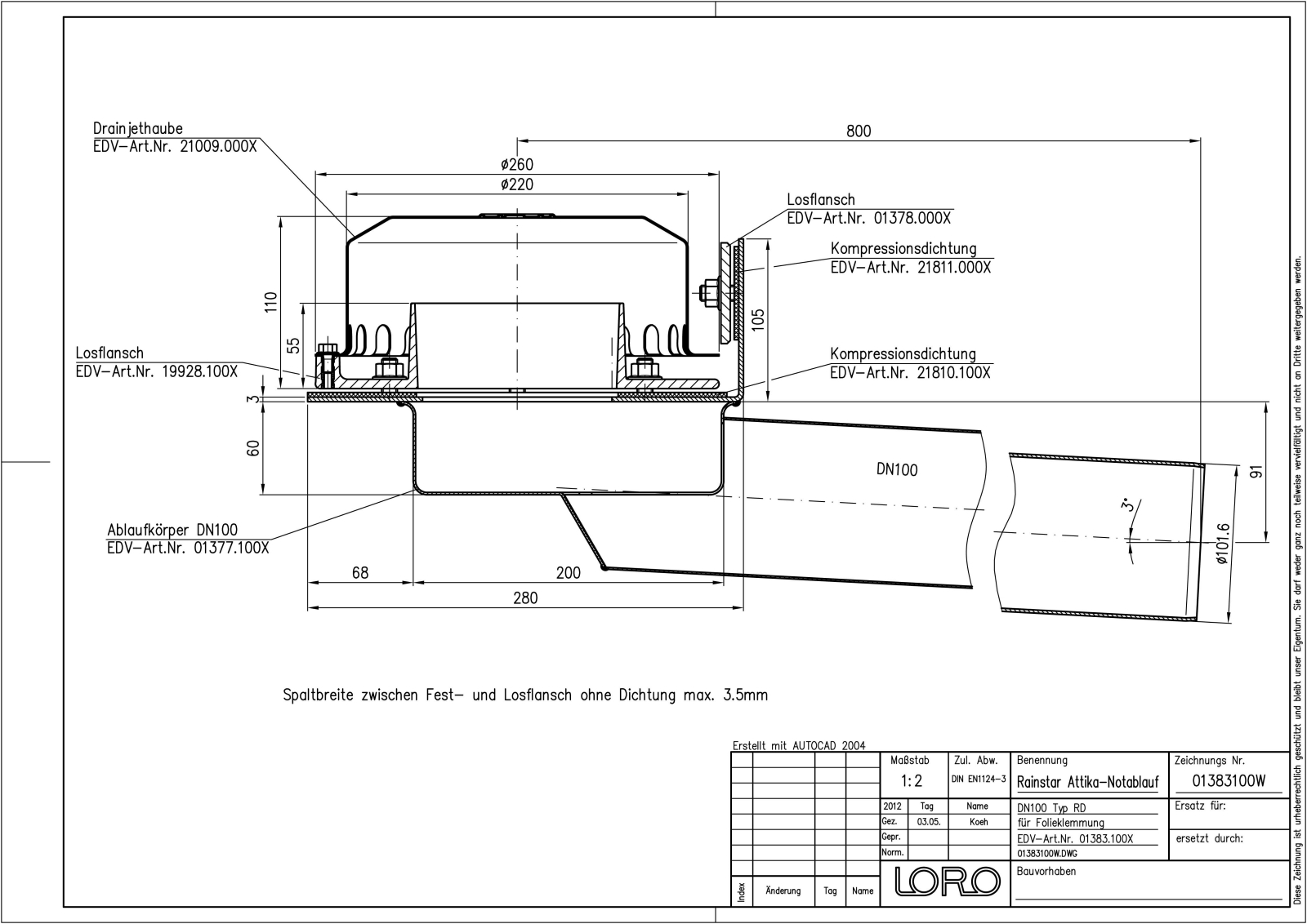 LORO-X RAINSTAR Attika-Schnellablauf, Serie 79 (RD) mit tiefgelegtem Rohr, für Notentwässerung mit Druckströmung, Abflussleistung 26,0 l/s bei 75 mm Wasserhöhe auf dem Dach, mit Klemmflansch, als Los- und Festflanschkonstruktion, 90 Grad Aufkantung für Kunststoff-Abdichtungsbahnen, Eingrifftiefe 106 mm, mit DRAINJET-Haube aus Edelstahl, nach DIN EN 1253, Leistungsnachweis mit normgerechtem Prüfsystem mit 4,2m nicht belüfteter Fallleitung gemäß Systemdatenblatt LX482, aus Edelstahl, DN 100