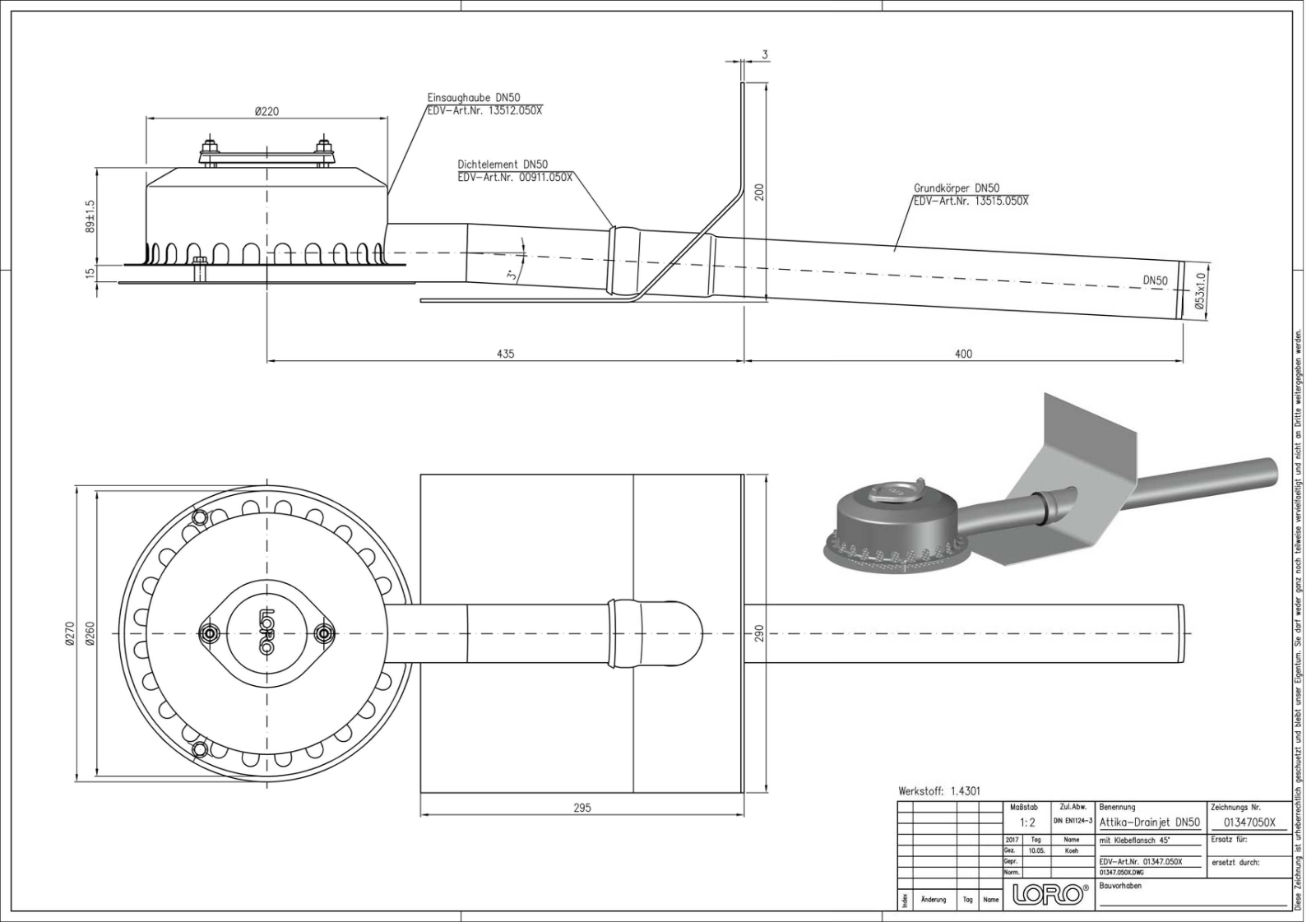 LORO-X DRAINJET Attika-Schnellablauf, Serie 62 ohne Eingriff ins Dach, für Hauptentwässerung mit Druckströmung, Abflussleistung 7,0 l/s bei 55 mm Wasserhöhe auf dem Dach, mit Klebeflansch, 45 Grad Aufkantung für Bitumen-Abdichtungsbahnen, Eingrifftiefe 0 mm, nach DIN EN 1253, Leistungsnachweis mit normgerechtem Prüfsystem mit 4,2m nicht belüfteter Fallleitung gemäß Systemdatenblatt LX789, aus Edelstahl, DN 50