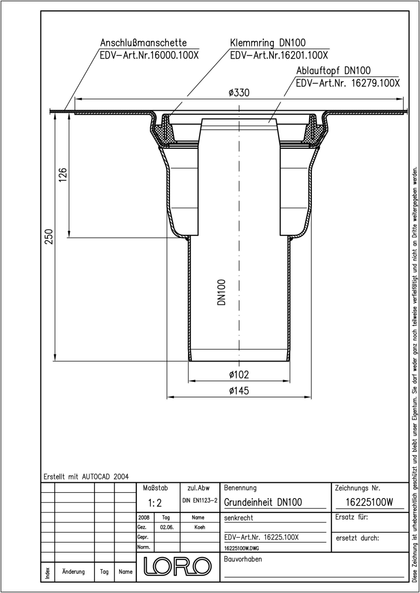 LORO-Balkondirektablauf-Grundeinheit, mit Anschlussmanschette aus Bitumen/EPDM-Verbund, Serie H, nach DIN EN 1253, aus Stahl, feuerverzinkt, , langlebige Innenbeschichtung gemäß DIN EN ISO 2178 auf Basis einer 2K-Epoxid-Kombination, Farbton: Rotbraun, Auslauf senkrecht, mit Fallrohrlänge 250 mm, ohne Wärmedämmung, bestehend aus Ablauftopf, Anschlussmanschette, Klemmring ohne Entwässerungsöffnungen, DN 100