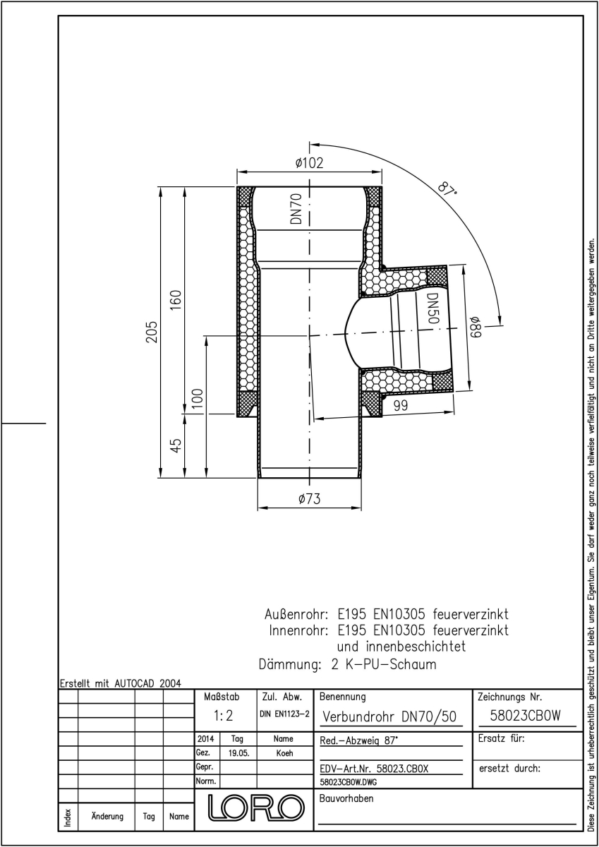 LORO-X Verbundrohr-Red.-Abzweig, bestehend aus Innenrohr (LORO-X Rohr, aus Stahl, feuerverzinkt, nach DIN EN 1123, mit erhöhtem Qualitätsstandard gemäß RAL-Gütezeichen GZ-694, mit 2-Kammern-Steckmuffenverbindung, Baustoffklasse A1, formstabil, bruchfest, rückstausicher, langlebige Innenbeschichtung gemäß DIN EN ISO 2178 auf Basis einer 2K-Epoxid-Kombination, Farbton: Rotbraun), Dämmschicht (PU-Hartschaum B2, FCKW-frei) und Außenrohr (LORO-X Rohr, feuerverzinkt), 87 Grad, DN 70/50