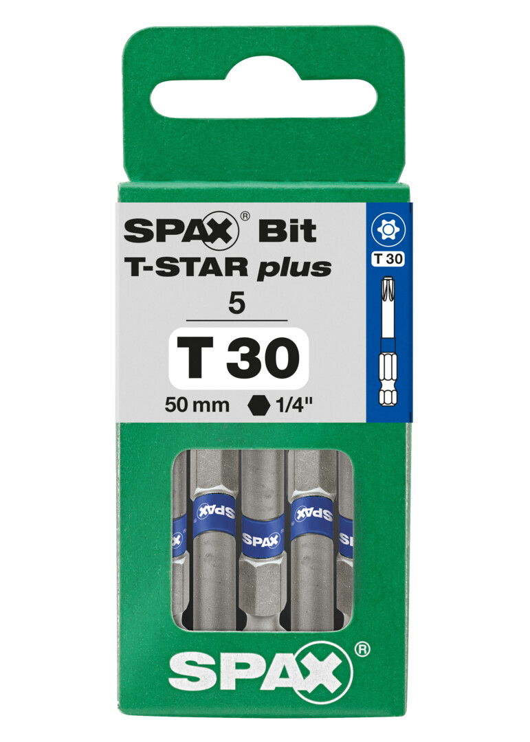Passend zu unserem SPAX Sortiment mit T-STAR plus Kraftangriff bieten wir exakt auf unsere Schrauben abgestimmte SPAX Bits in T-STAR plus-Ausführung, gut erkennbar an der orangenen Farbcodierung.